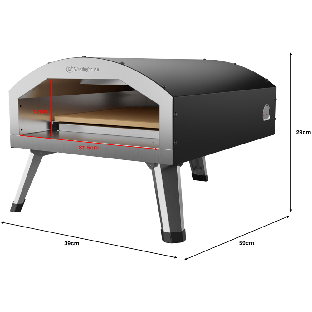 Enjoy delicious homemade pizzas with this Westinghouse 81060 Black 12 inch Electric Pizza Oven. It cooks 12-inch pizzas indoors and outdoors easily. This electric oven operates with temperatures between 100-450 degrees Celsius and burns any food residue while pre-heating. Simply preheat this oven, brush away the excess debris on the stone, and cook an authentic pizza in two minutes. Easy to use and clean, it's the perfect way to enjoy pizzas with your friends and family.
