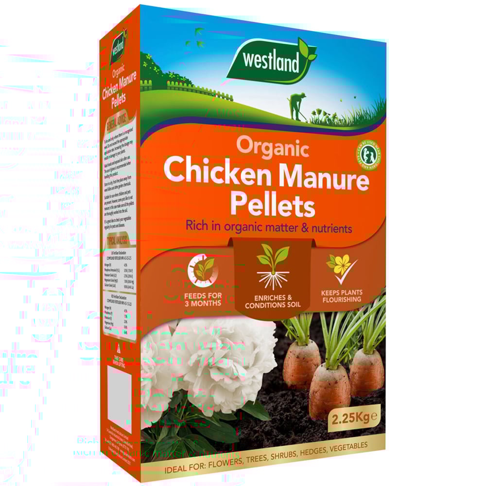 Boost plant health naturally with the Westland Organic Chicken Manure Pellets 2.25kg. This pack is rich in organic matter and essential nutrients that enhance soil quality and support vigorous plant growth. Designed to feed plants for up to three months, these pellets improve the soil's delicate balance, helping your garden thrive season after season. Use Instructions: Recommend wearing gloves when using this product.