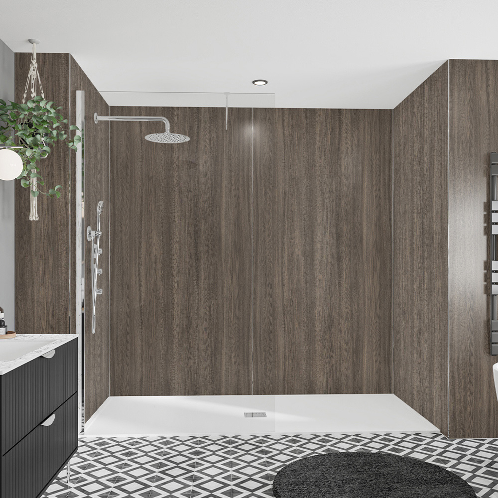 American Walnut wall panel is a dark walnut wood effect decor, in deep brown tones with an intricate woodgrain. Achieve the look of wood in the bathroom with ease. Transform your bathroom with the patterns of the Wetwall Alloy Decor Range.