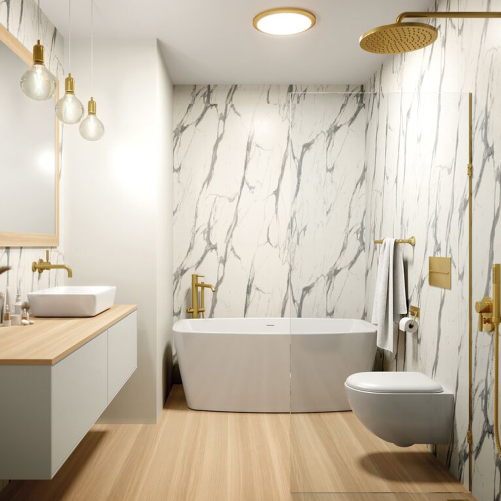 Calacatta Statuario is a striking marble effect shower panel, with dramatic dark grey veining throughout. Achieve a luxurious bathroom update on a budget with our cost-effective wall panels.