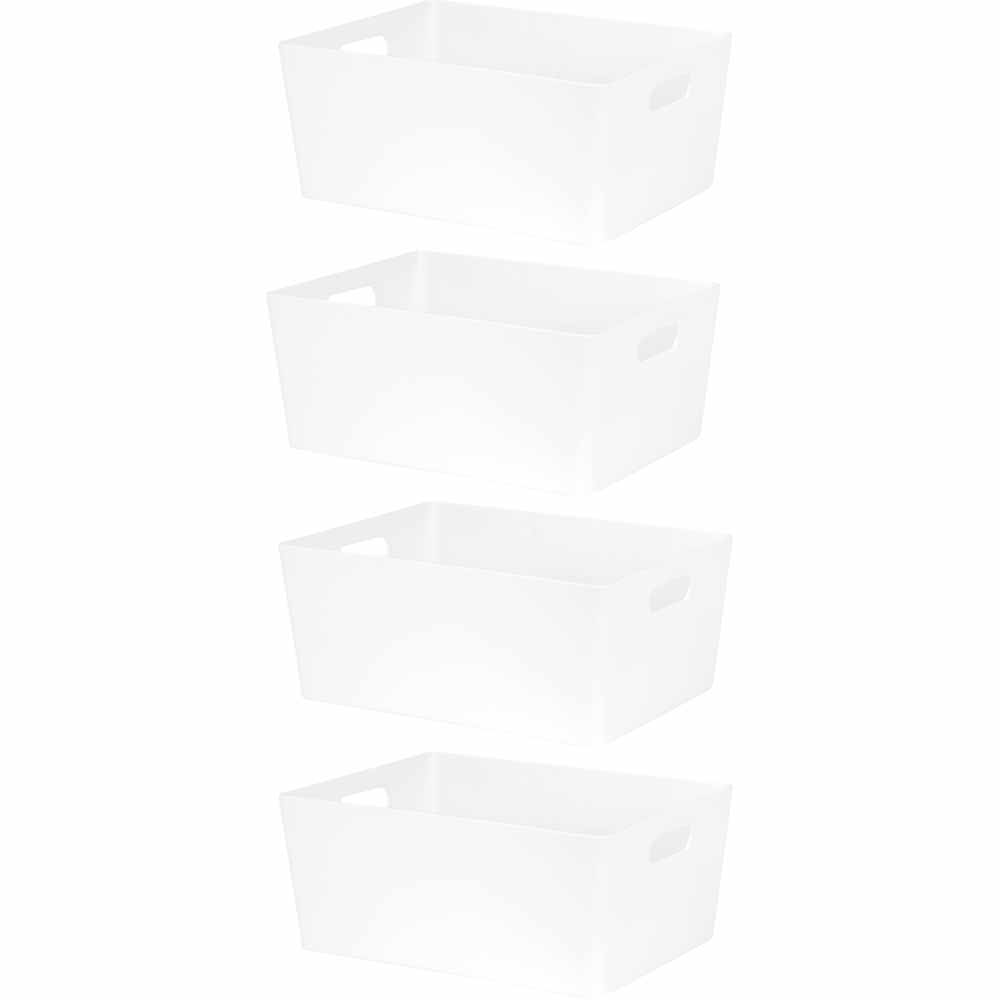 Organise your daily routine accessories and keep your home clutter-free with this Studio 5.02 basket set by Wham. The set includes four large-sized storage boxes in a contemporary design with a high gloss finish. Sleek and versatile, and suited to displaying your craft accessories, bathroom toiletries, makeup, pantry goods, cleaning and laundry products and stationary. The handle aids easy access to slide the baskets when stored on shelves. Ideal for keeping various thing easily accessible, the baskets will be a great addition to any household. Dimensions: 26 x 35 x 15 cm. Size: Pack of 4.