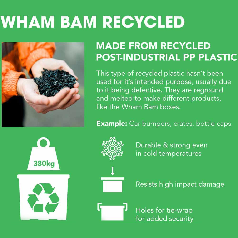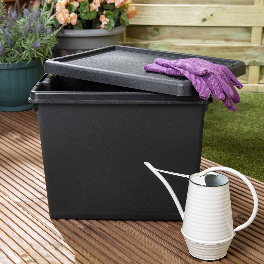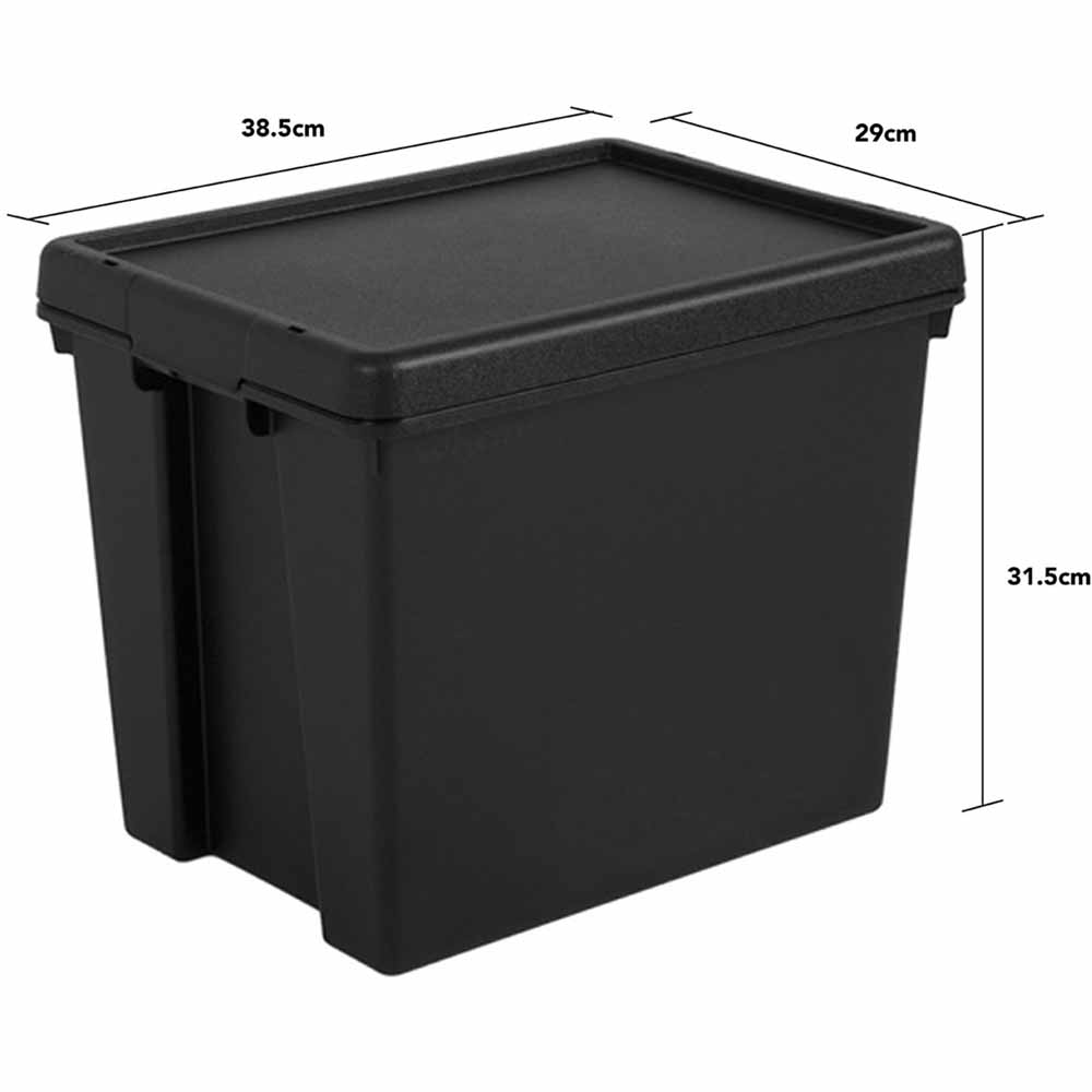 Keep all your essentials safely stored away with this Wham 24L Black Recycled Storage Box 5 Pack. These 24 litre plastic boxes are made from recycled plastic. The lid snaps into place and there are holes at each end of the boxes for you to weave tie wraps through for added security. These strong, heavy duty, durable and strength tested storage boxes are suitable for any room in the home.
