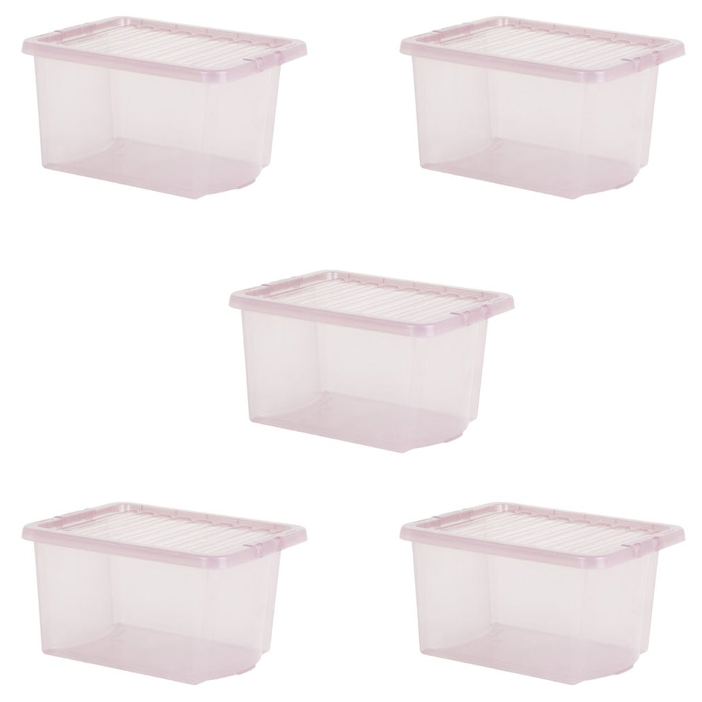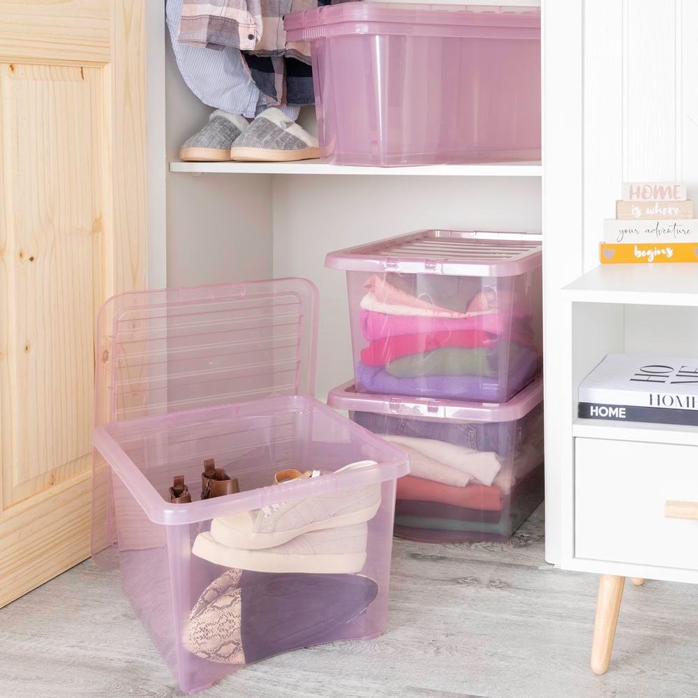 A versatile storage option, this Wham 28L Pink Crystal Storage Box with Lid 5 Pack is the perfect storage accessory. This set of five high quality large 28-litre capacity storage boxes comes with a clip-on lid. The boxes are suitable for all around the home and workplace. These handy storage boxes are translucent, so the contents are easily visible. These storage boxes are best suited for displaying your craft accessories, bathroom toiletries, makeup, pantry goods, cleaning and laundry products, stationery or toys. These boxes are stackable when in use and nest when not. The storage boxes are made in the UK. Product dimensions 42.5 x 36 x 25.5cm.