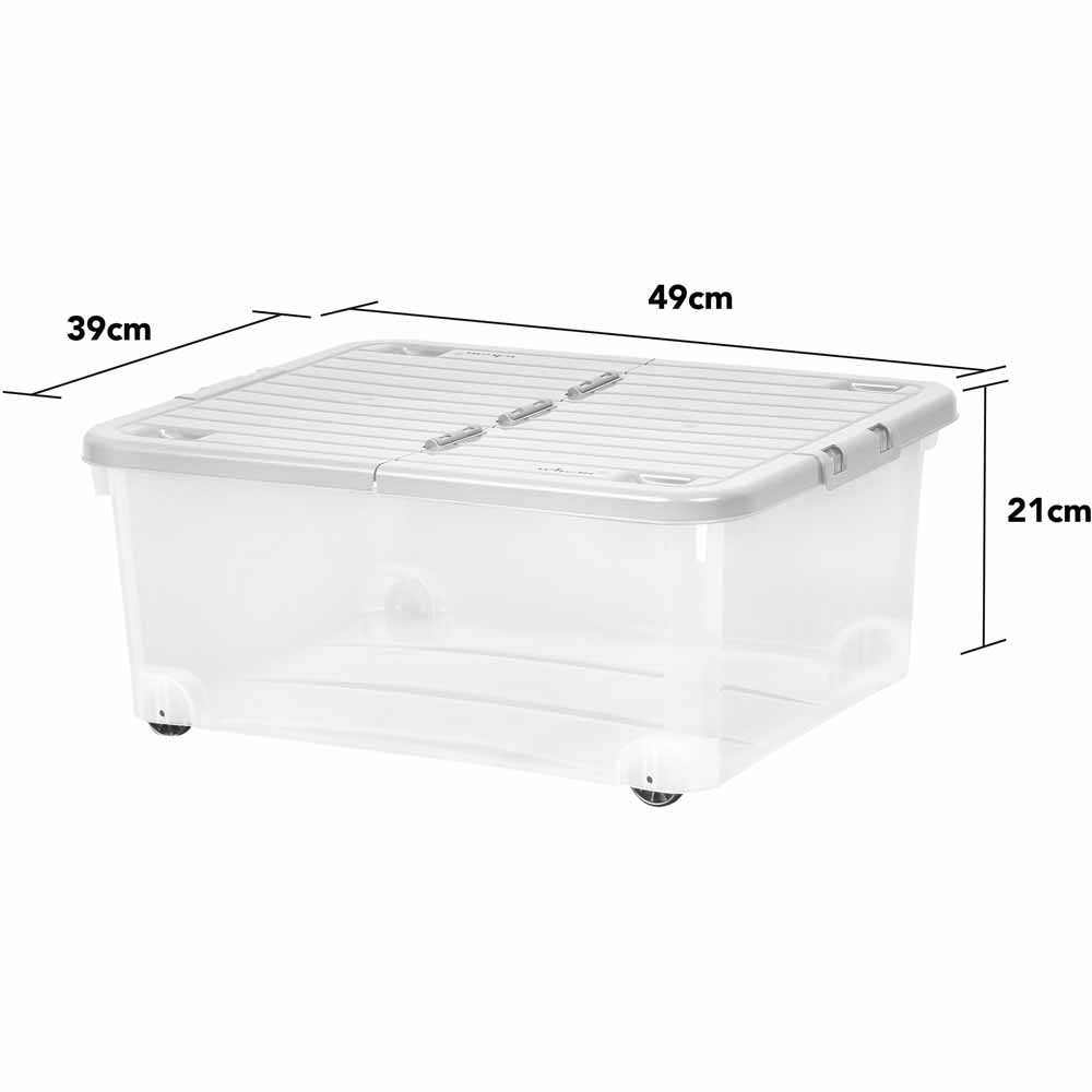 Declutter just about any working space and keep it neat with this Wham 30L Grey Storage Box with Wheels and Lid 3 Pack. The set includes three high-quality boxes with double wheels and reinforced corners for extra stability and strength. They have a folding split lid which offers seamless access to the contents. Their stackable design allows you to nest them together for compact storage and saving on space. Ideal for homes, school or offices, the storage box is just what you need to your place clutter-free. Dimensions: 49 x 39 x 21 cm. Size: Pack of 3. Capacity: 30L.