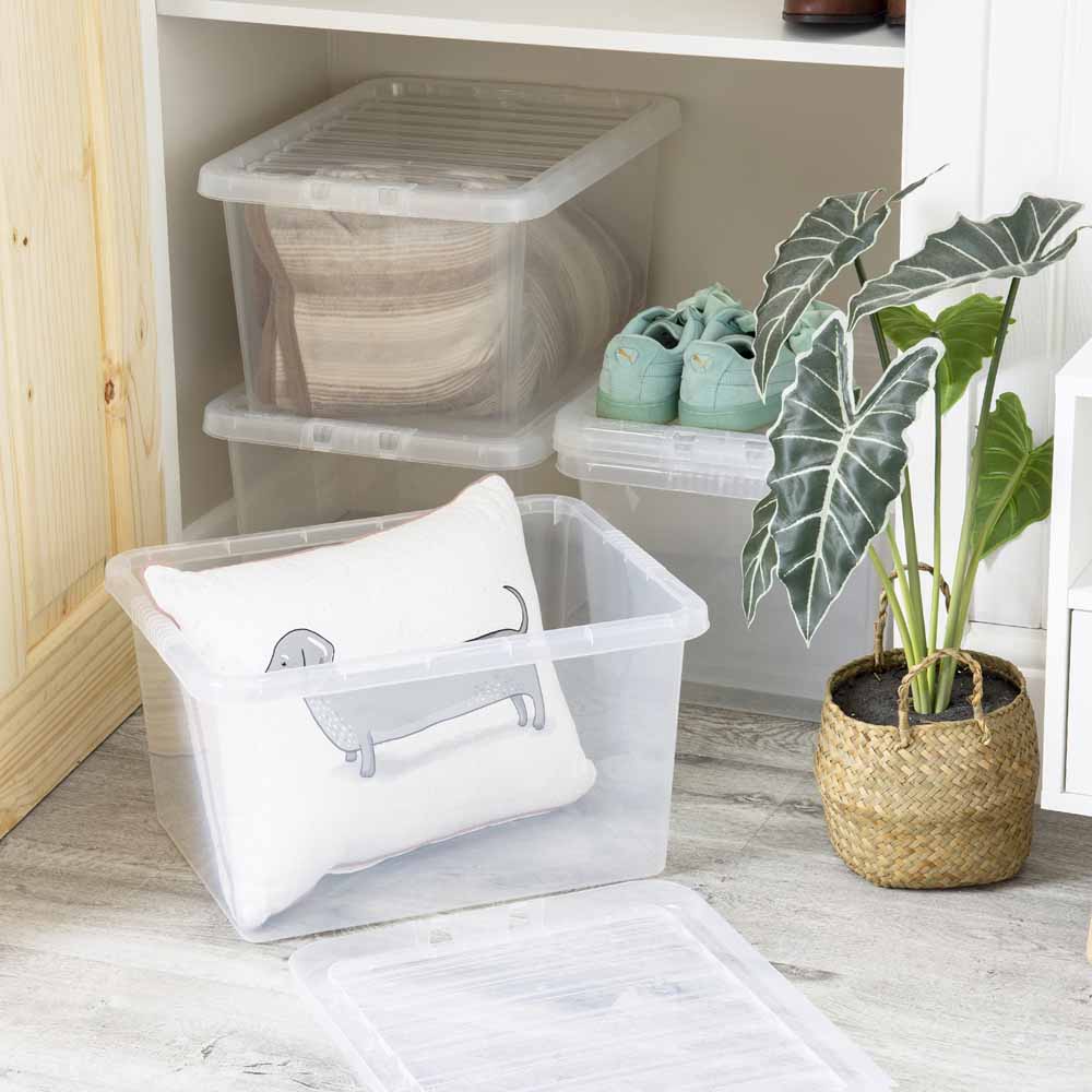 Keep your things nicely organised with Wham 31L Crystal Storage Box with Lid 5 Pack. These versatile storage boxes are suitable for all around the home and workplace. The box has a clear base, so you can easily view the box contents. Boxes are stackable when in use and nest when not. The boxes are made in the UK.