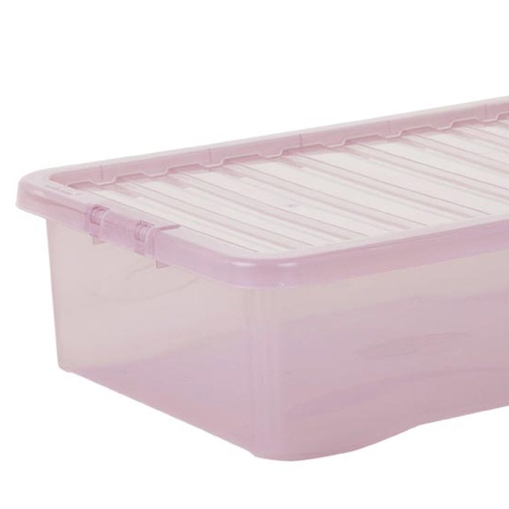 A versatile storage option, this Wham 32L Pink Crystal Storage Box with Lid 5 Pack is the perfect storage accessory. This set of five high quality large 32-litre capacity storage boxes comes with a clip-on lid. The boxes are suitable for all around the home and workplace. These handy storage boxes are translucent, so the contents are easily visible. These storage boxes are best suited for displaying your craft accessories, bathroom toiletries, makeup, pantry goods, cleaning and laundry products, stationery or toys. These boxes are stackable when in use and nest when not. The storage boxes are made in the UK. Product dimensions 60 x 40 x 18cm.