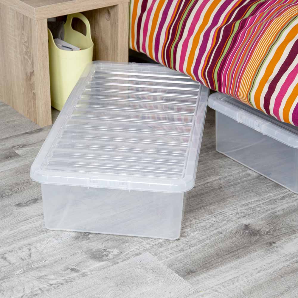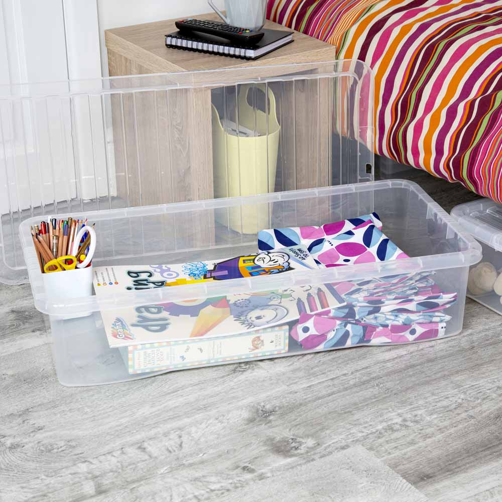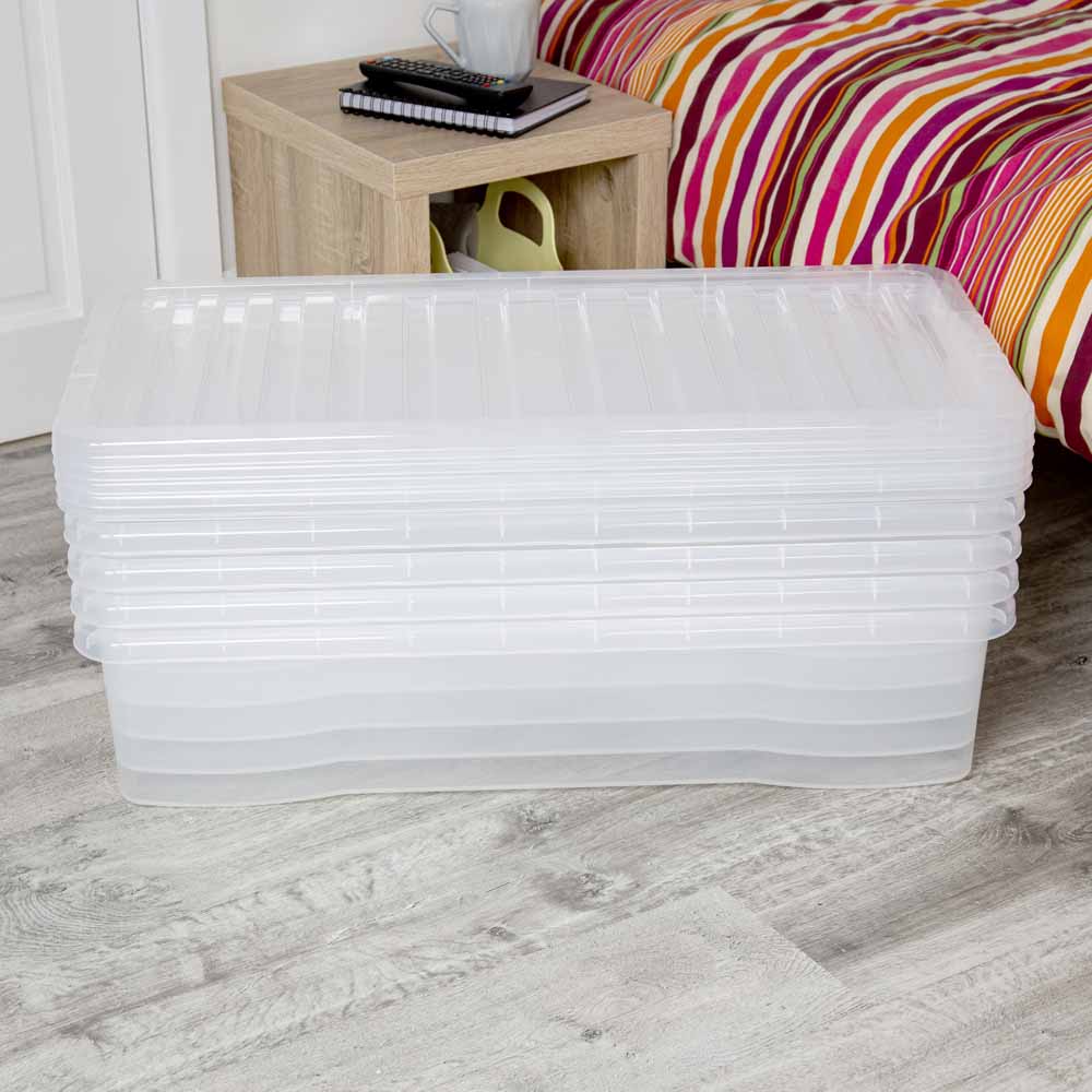 Organise your space with the Wham 42L Crystal Storage Box with Lid 5 Pack. Perfect for home and office use, the storage boxes are ideal for hiding away those knick-knacks and paperwork. At 42L, they're large and shallow enough to store clothes, bedding and pillows and slide under your bed. The storage boxes feature built-in side handles for easy handling and a secure lid. There are five space-saving storage boxes in this set. Dimensions: L 79.50 x W 39.50 x H 18.00 cm