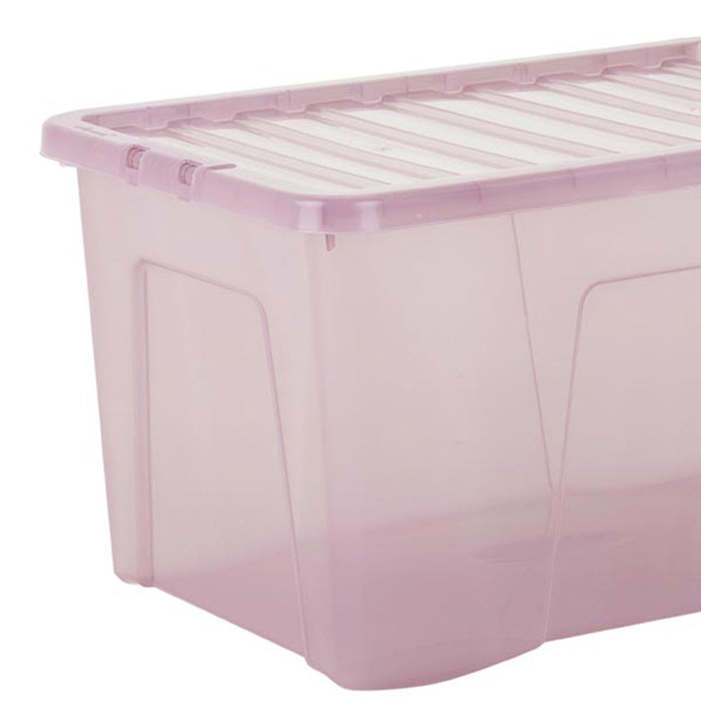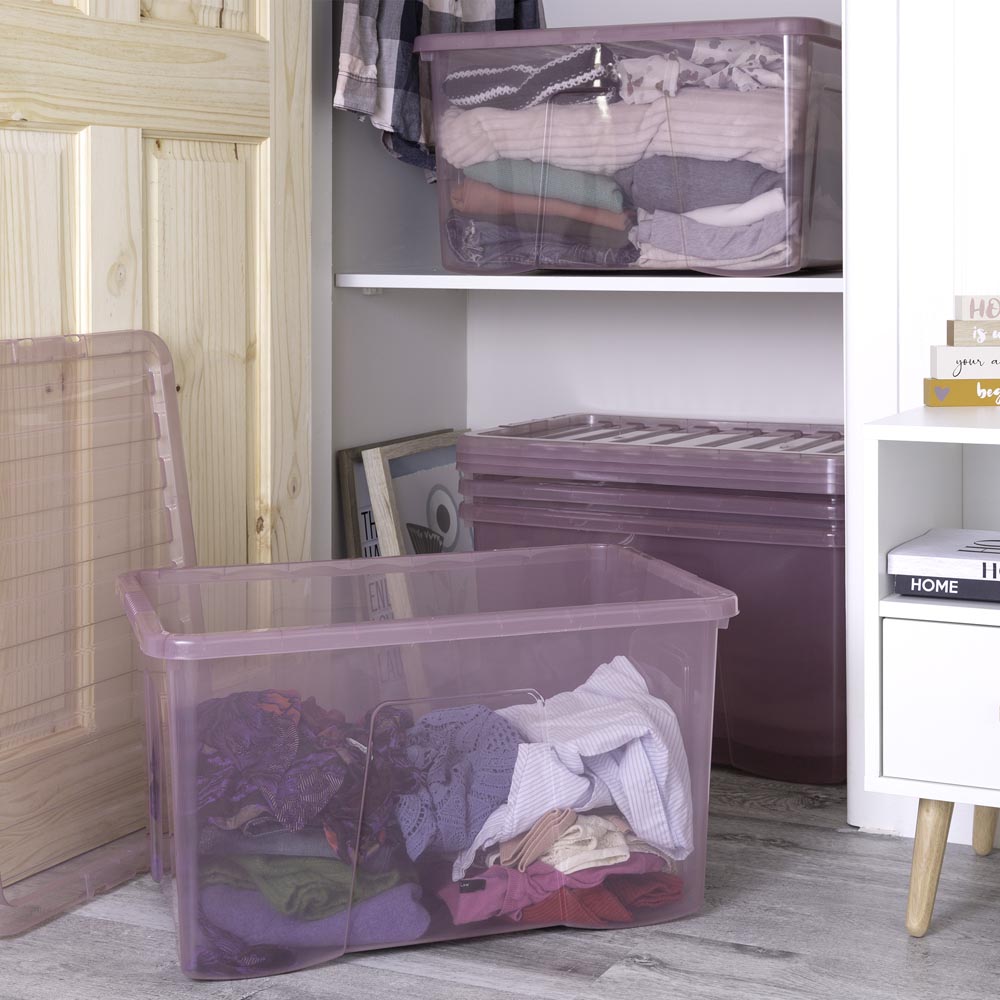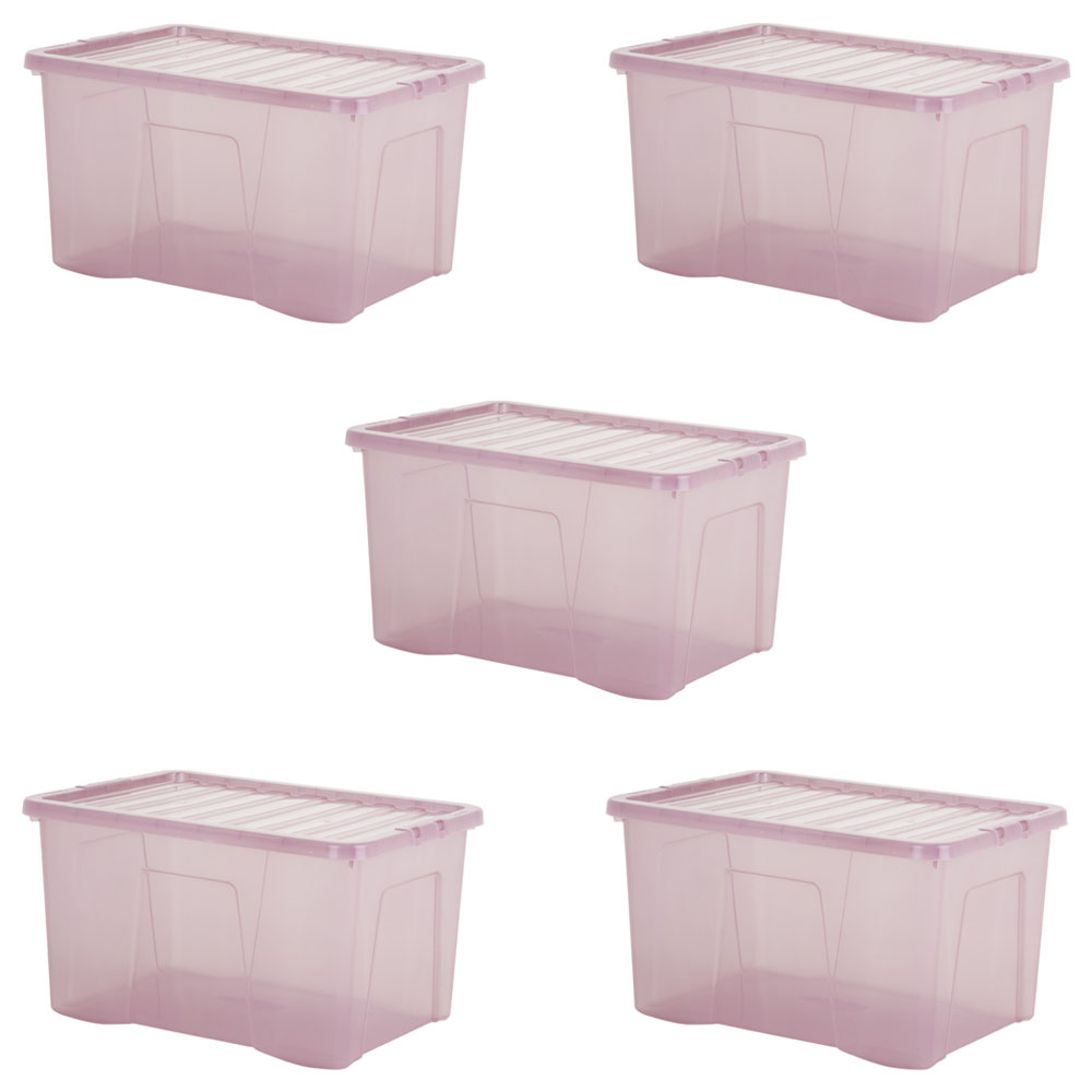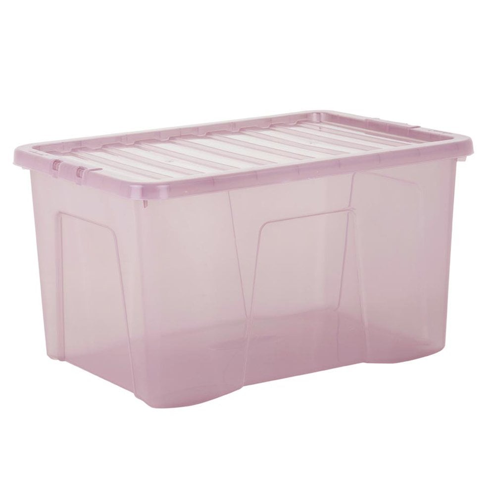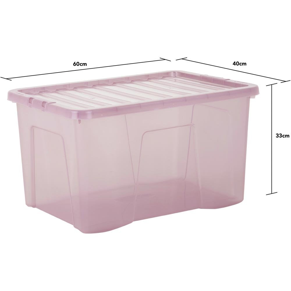 A versatile storage option, this Wham 60L Pink Crystal Storage Box with Lid 5 Pack is the perfect storage accessory. This set of five high quality large 60-litre capacity storage boxes comes with a clip-on lid. The boxes are suitable for all around the home and workplace. These handy storage boxes are translucent, so the contents are easily visible. These storage boxes are best suited for displaying your craft accessories, bathroom toiletries, makeup, pantry goods, cleaning and laundry products, stationery or toys. These boxes are stackable when in use and nest when not. The storage boxes are made in the UK. Product dimensions 60 x 40 x 33cm.