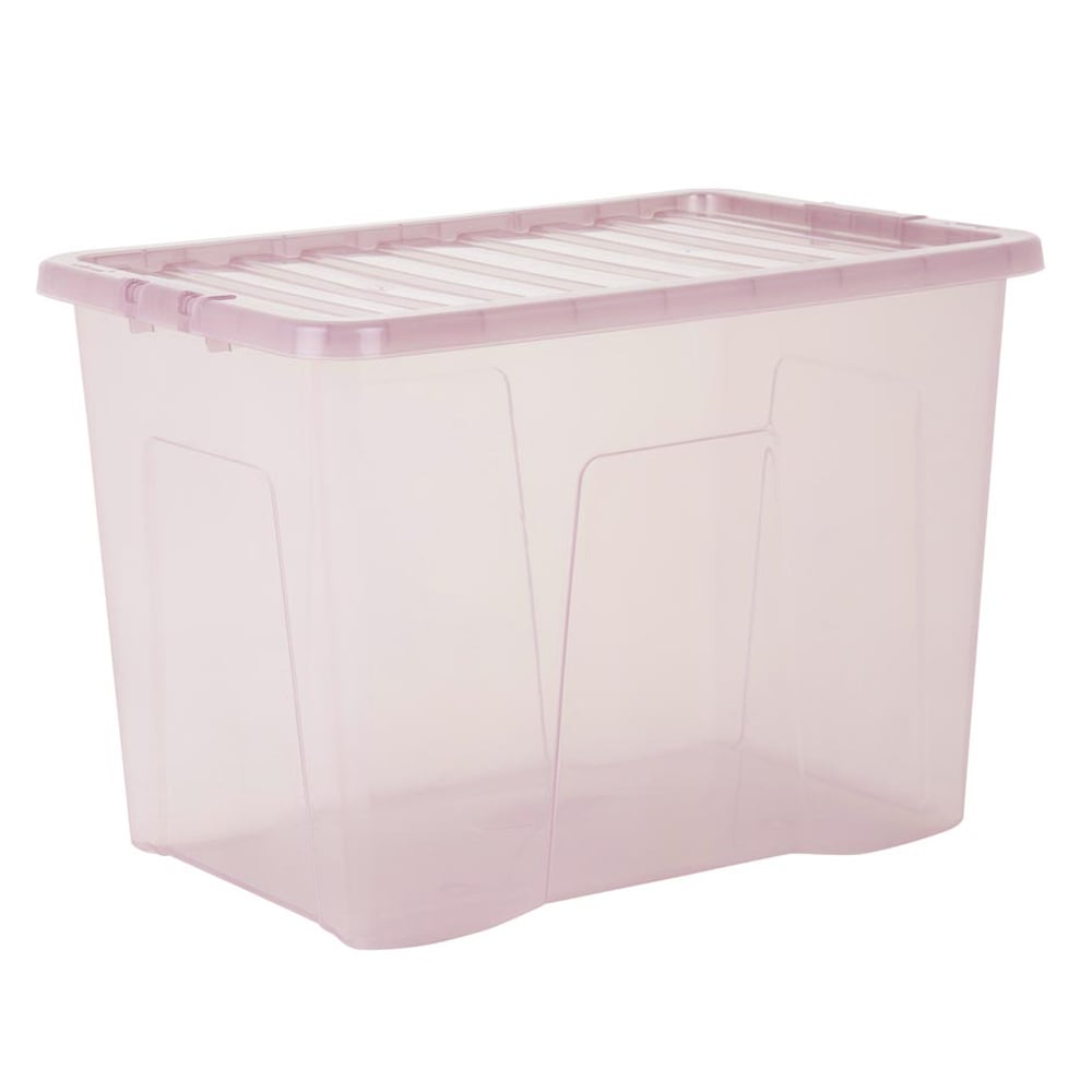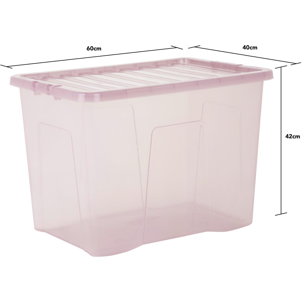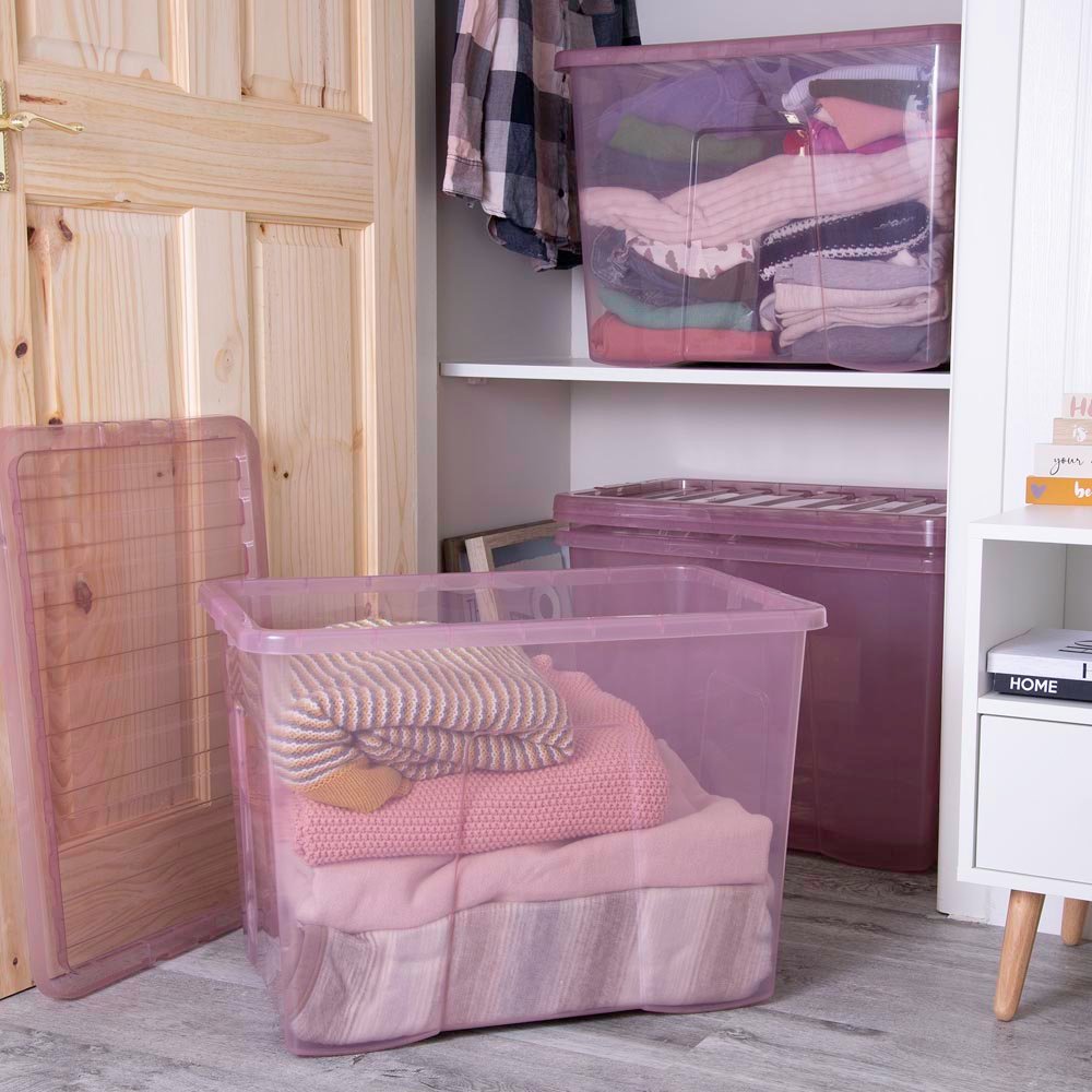 A versatile storage option, this Wham 80L Pink Crystal Storage Box with Lid 4 Pack is the perfect storage accessory. This set of four high quality large 80-litre capacity storage boxes comes with a clip-on lid. The boxes are suitable for all around the home and workplace. These handy storage boxes are translucent, so the contents are easily visible. These storage boxes are best suited for displaying your craft accessories, bathroom toiletries, makeup, pantry goods, cleaning and laundry products, stationery or toys. These boxes are stackable when in use and nest when not. The storage boxes are made in the UK. Product dimensions 60 x 40 x 42cm.