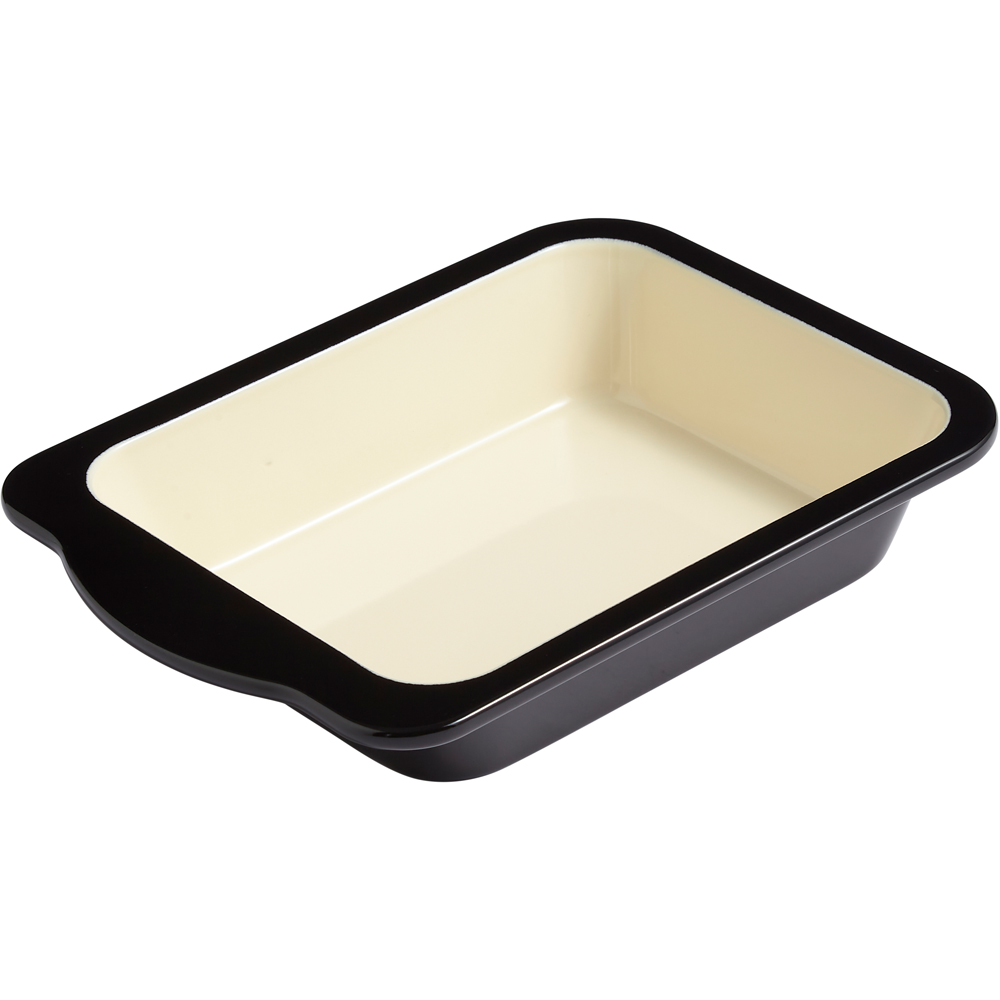 Two premium and durable Two Tone Enamel Baking Trays. Suitable for oven use, stove top, induction hobs, on a BBQ or any naked flame, Metal utensil safe, Premium steel coated vitreous enamel, Made in the UK (Lancashire). Dimensions: 22cm x 17cm x 5cm.