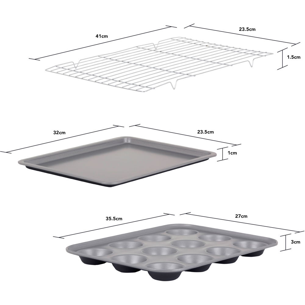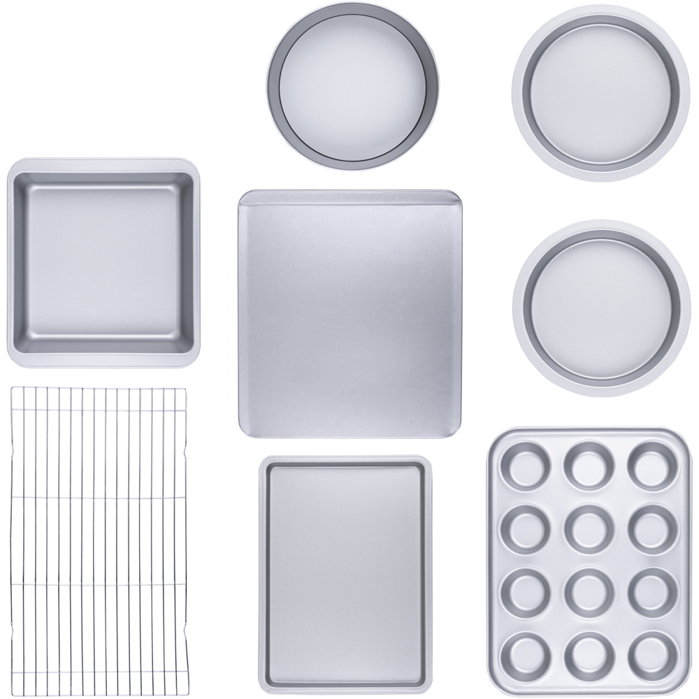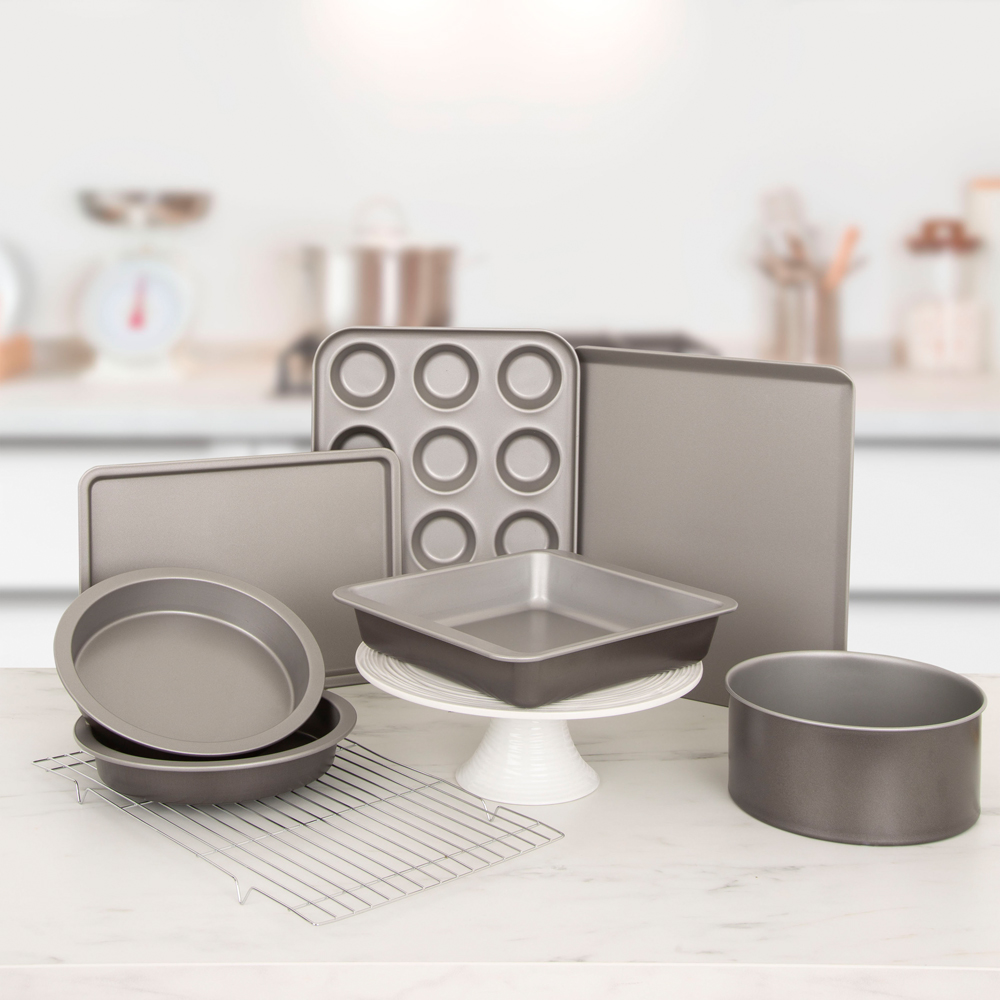Equip your kitchen with the Wham Baker & Salt 8-Piece Beginner Baking Set. This premium quality, non-stick, easy-release bakeware set in silver is perfect for bakers and makes an excellent gift. The double non-stick coating ensures easy release, allowing cakes to slide out effortlessly after baking. The set includes all essential tips to get started, along with a high-quality steel cooling rack to meet various baking needs. Each piece is crafted from steel with a robust, easy-release, non-stick coating for reliable performance.