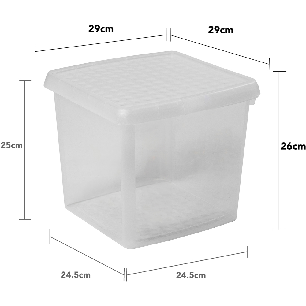 Go for a space-saving solution to simplify and arrange every room in your home or workplace with the Wham Clip 14L Clear Square Storage Box with Lid 4 Pack. This storage box features a clear base, allowing you to easily see its contents, making it perfect for sorting and storing various items such as toys, clothes, household textiles and bedlinen, photographs, travel keepsakes, crafting supplies, and more. You can maximise your storage space by stacking it and placing it on shelves, in cupboards, and in wardrobes. The box is 100% recyclable and comes with a unique clip-lock closure that securely locks the lid in place. Made by What More UK from premium, first-grade materials, the storage box is durable and built to last. It is also BPA-free, making it safe for food storage. When not in use, the storage box neatly nests together, and it can be stacked safely when needed. With its innovative design, the storage box is ideal for simplifying and organising your everyday life. Capacity: 14L. Dimensions: External: 29 x 29 x 26cm. Internal: 23.5 x 23.5 x 25cm.