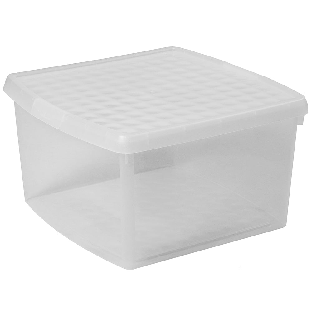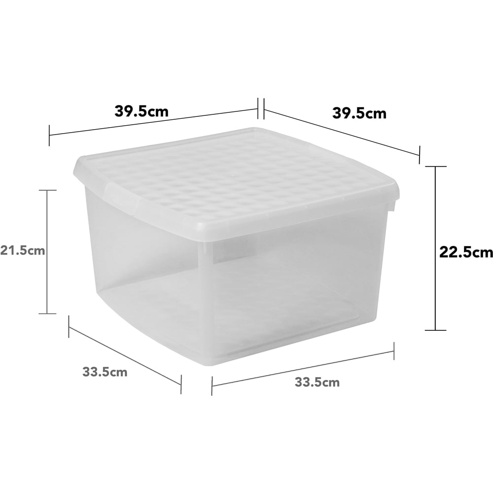 Go for a space-saving solution to simplify and arrange every room in your home or workplace with the Wham Clip 25.5L Clear Square Storage Box with Lid. This storage box features a clear base, allowing you to easily see its contents, making it perfect for sorting and storing various items such as toys, clothes, household textiles and bedlinen, photographs, travel keepsakes, crafting supplies, and more. You can maximise your storage space by stacking it and placing it on shelves, in cupboards, and in wardrobes. The box is 100% recyclable and comes with a unique clip-lock closure that securely locks the lid in place. Made by What More UK from premium, first-grade materials, the storage box is durable and built to last. It is also BPA-free, making it safe for food storage. When not in use, the storage box neatly nests together, and it can be stacked safely when needed. With its innovative design, the storage box is ideal for simplifying and organising your everyday life. Capacity: 25.50L. Dimensions: External: 39.5 x 39.5 x 22.5cm. Internal: 33.5 x 33.5 x 21.5cm.
