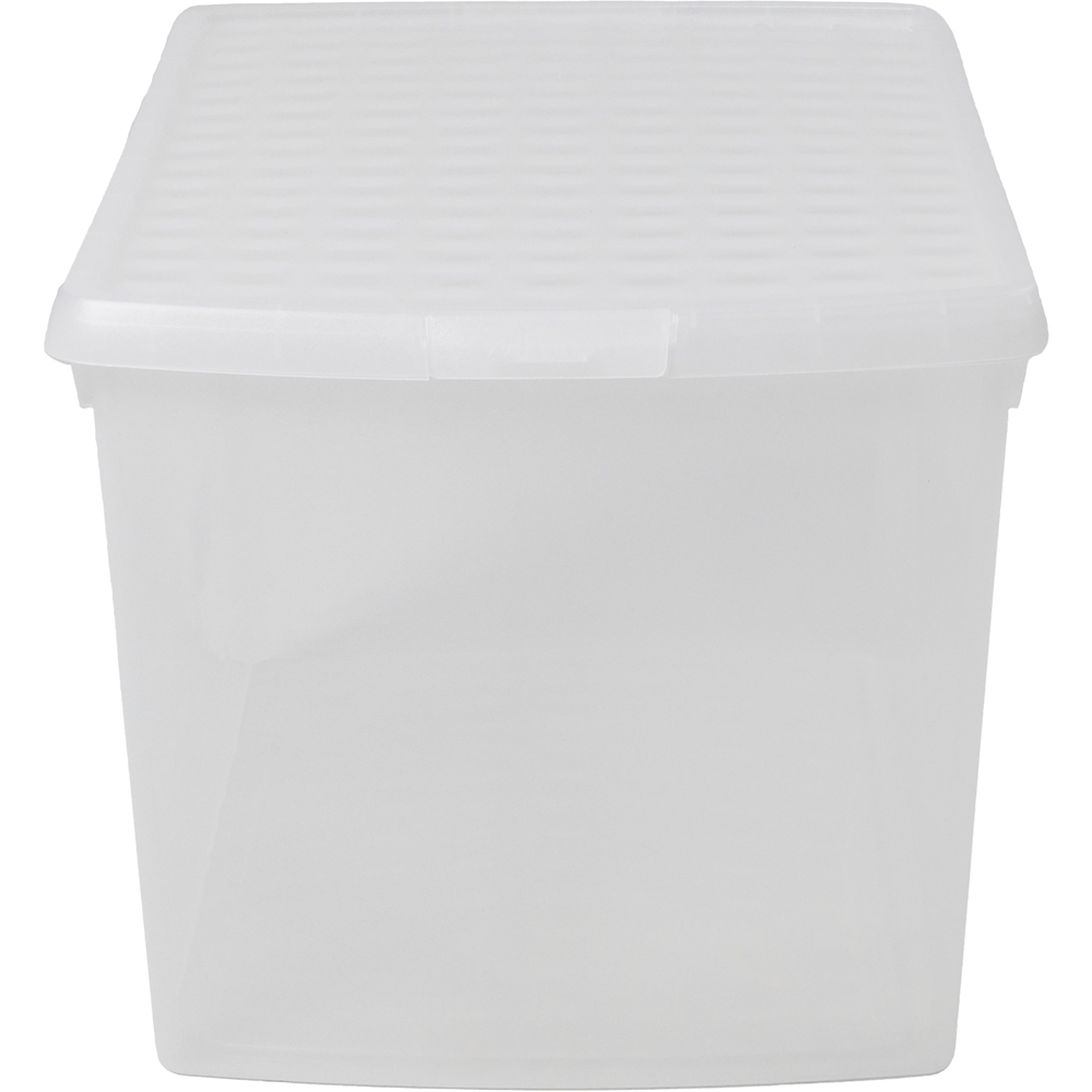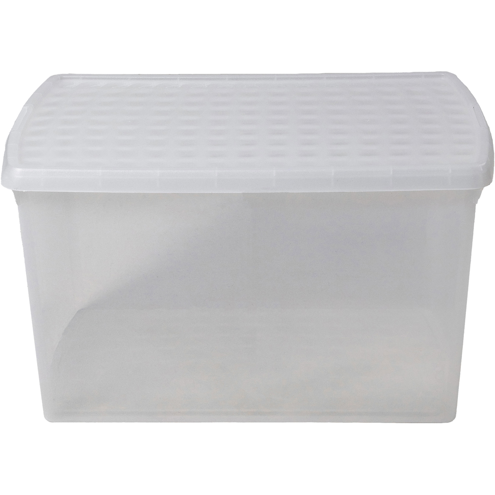Go for a space-saving solution to simplify and arrange every room in your home or workplace with the Wham Clip 62L Clear Rectangular Storage Box with Lid 3 Pack. This storage box features a clear base, allowing you to easily see its contents, making it perfect for sorting and storing various items such as toys, clothes, household textiles and bedlinen, photographs, travel keepsakes, crafting supplies, and more. You can maximise your storage space by stacking it and placing it on shelves, in cupboards, and in wardrobes. The box is 100% recyclable and comes with a unique clip-lock closure that securely locks the lid in place. Made by What More UK from premium, first-grade materials, the storage box is durable and built to last. It is also BPA-free, making it safe for food storage. When not in use, the storage box neatly nests together, and it can be stacked safely when needed. With its innovative design, the storage box is ideal for simplifying and organising your everyday life. Capacity: 62L. Dimensions: External: 59.5 x 39.5 x 33.5cm. Internal: 52.5 x 32.5 x 33cm.
