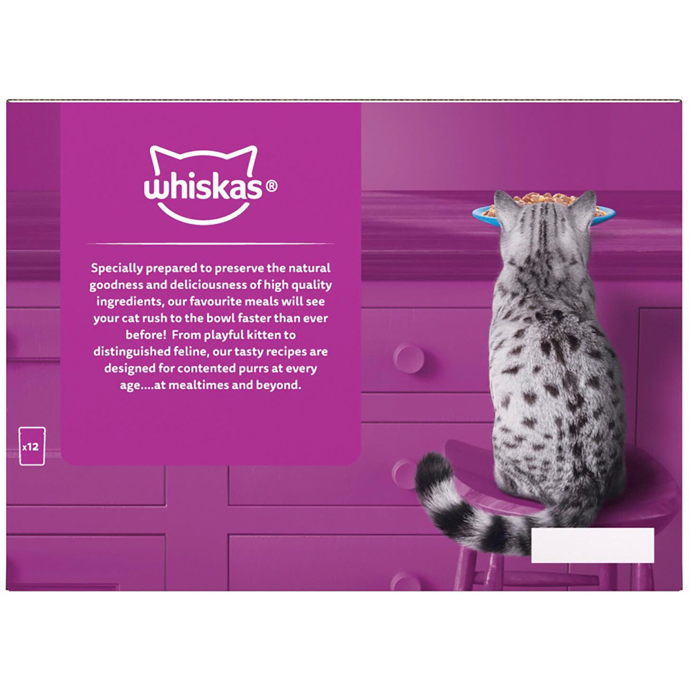 Give your cat a delicious treat with Whiskas 1+ Fish Favourites in Jelly Wet Adult Cat Food 85g 12 Pack, featuring a tempting blend of their favourite fish in a flavourful jelly. Crafted with premium ingredients, this wet cat food meets all the daily nutritional needs of your pet. Serve it on its own or pair it with dry food for a scrumptious and wholesome meal. Feeding guidelines: Account for the calories coming from treats. Feeding amounts are intended as guidelines only. Adjust the amount of food according to the age, size and activity level of your cat. Divide into portions for feeding throughout the day. For more detailed information, please visit the website. Fresh water should always be available. Serve at room temperature, surplus food can be chilled for up to two days. For a 3kg cat, feed 3 - 3.5, for a 4kg cat, feed 3.5 - 4, and for a 5kg cat, feed 4 - 4.5. One can be replaced by 16g of Whiskas dry food. Each can contain 62kcal per 85g. Ingredients: Salmon: Meat and animal derivatives (33%), fish and fish derivatives (including 4% salmon in the chunk), cereals, minerals, derivatives of vegetable origin, various sugars, chunks typically 40% of the product. With Tuna: Meat and animal derivatives (33%), fish and fish derivatives (including 4% tuna in the chunk), cereals, minerals, derivatives of vegetable origin, various sugars, chunks typically 40% of the product. With Cod: Meat and animal derivatives (33%), fish and fish derivatives (including 4% cod in the chunk), cereals, minerals, derivatives of vegetable origin, various sugars, chunks typically 40% of the product. With Whitefish: Meat and animal derivatives (33%), fish and fish derivatives (including 4% whitefish in the chunk), cereals, minerals, derivatives of vegetable origin, various sugars, chunks typically 40% of the product. Nutrition: With Salmon: Protein: 7.8%, fat content: 4.0%, inorganic matter: 1.6%, crude fibre: 0.25%, moisture: 84.5%, additives per kg: Nutritional additives: vitamin C: 702mg, vitamin D3: 200 IU (vitamin D3 not supplemented in salmon and tuna varieties), taurine: 620mg, copper (copper(II) sulphate pentahydrate): 1.2mg, iodine (calcium iodate, anhydrous): 0.22mg, iron (iron(II) sulphate monohydrate): 11.2mg, manganese (manganous sulphate, monohydrate): 2.2mg, zinc (zinc sulphate, monohydrate): 16.2mg, technological additives: cassia gum: 2148mg, sensory additives: flavourings. With Tuna: Protein: 7.8%, fat content: 4.0%, inorganic matter: 1.6%, crude fibre: 0.25%, moisture: 84.5%, additives per kg: Nutritional additives: vitamin C: 702mg, vitamin D3: 200 IU (vitamin D3 not supplemented in salmon and tuna varieties), taurine: 620mg, copper (copper(II) sulphate pentahydrate): 1.2mg, iodine (calcium iodate, anhydrous): 0.22mg, iron (iron(II) sulphate monohydrate): 11.2mg, manganese (manganous sulphate, monohydrate): 2.2mg, zinc (zinc sulphate, monohydrate): 16.2mg, technological additives: cassia gum: 2148mg, sensory additives: flavourings. With Cod: Protein: 7.8%, fat content: 4.0%, inorganic matter: 1.6%, crude fibre: 0.25%, moisture: 84.5%, additives per kg: Nutritional additives: vitamin C: 702mg, vitamin D3: 200 IU (vitamin D3 not supplemented in salmon and tuna varieties), taurine: 620mg, copper (copper(II) sulphate pentahydrate): 1.2mg, iodine (calcium iodate, anhydrous): 0.22mg, iron (iron(II) sulphate monohydrate): 11.2mg, manganese (manganous sulphate, monohydrate): 2.2mg, zinc (zinc sulphate, monohydrate): 16.2mg, technological additives: cassia gum: 2148mg, sensory additives: flavourings. With Whitefish: Protein: 7.8%, fat content: 4.0%, inorganic matter: 1.6%, crude fibre: 0.25%, moisture: 84.5%, additives per kg: Nutritional additives: vitamin C: 702mg, vitamin D3: 200 IU (vitamin D3 not supplemented in salmon and tuna varieties), taurine: 620mg, copper (copper(II) sulphate pentahydrate): 1.2mg, iodine (calcium iodate, anhydrous): 0.22mg, iron (iron(II) sulphate monohydrate): 11.2mg, manganese (manganous sulphate, monohydrate): 2.2mg, zinc (zinc sulphate, monohydrate): 16.2mg, technological additives: cassia gum: 2148mg, sensory additives: flavourings.