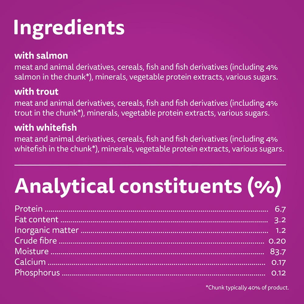 Treat your feline friend to the delicious Whiskas 1+ Ocean Menu in Jelly Wet Adult Cat Food Tin 400g 6 Pack, crafted to deliver an irresistible taste in every bite. This premium cat food features high-quality protein and is formulated to meet 100% of your cat's daily nutritional needs. With balanced minerals supporting a healthy urinary tract and zinc for a radiant coat, this food is sure to have your cat purring with delight. Feeding guidelines: Daily feeding recommendations account for the calories coming from treats. Adjust the amount of food to your cat's needs. Serve at room temperature; surplus food can be chilled for up to two days. 3kg: 225 - 275g, 4kg: 275 - 325g, 5kg: 325 - 375g 73 kcal per 100 g. 100g = 18 - 21g. 100g wet food can be replaced by 18 - 21g Whiskas dry food. Ingredients: with salmon: meat and animal derivatives, cereals, fish and fish derivatives (including 4% salmon in the chunk), minerals, vegetable protein extracts, various sugars, chunk typically 40% of the product. With trout: meat and animal derivatives, cereals, fish and fish derivatives (including 4% trout in the chunk), minerals, vegetable protein extracts, various sugars, chunk typically 40% of the product. With whitefish: meat and animal derivatives, cereals, fish and fish derivatives (including 4% whitefish in the chunk), minerals, vegetable protein extracts, and various sugars, the chunk is typically 40% of the product. Nutrition: with salmon: analytical constituents (%): protein 6.7, fat content 3.2, inorganic matter 1.2, crude fibre 0.20, moisture 83.7, calcium 0.17, phosphorus 0.12, additives per kg: Nutritional additives: vitamin B1 31.5 mg, vitamin D3 250 IU (vitamin D3 not supplemented in salmon and trout varieties), vitamin E 21.0mg, taurine 650mg, copper (copper(II) sulphate pentahydrate) 0.64mg, iodine (calcium iodate anhydrous) 0.22mg, iron (iron(II) sulphate monohydrate) 10.9mg, manganese (manganous sulphate monohydrate) 2.2mg, zinc (zinc sulphate monohydrate) 16.8mg, technological additives: cassia gum 2100mg. With trout: protein 6.7, fat content 3.2, inorganic matter 1.2, crude fibre 0.20, moisture 83.7, calcium 0.17, phosphorus 0.12, additives per kg: Nutritional additives: vitamin B1 31.5mg, vitamin D3 250 IU (vitamin D3 not supplemented in salmon and trout varieties), vitamin E 21.0mg, taurine 650mg, copper (copper(II) sulphate pentahydrate) 0.64mg, iodine (calcium iodate anhydrous) 0.22mg, iron (iron(II) sulphate monohydrate) 10.9mg, manganese (manganous sulphate monohydrate) 2.2mg, zinc (zinc sulphate monohydrate) 16.8mg, technological additives: cassia gum 2100mg. With whitefish: protein 6.7, fat content 3.2, inorganic matter 1.2, crude fibre 0.20, moisture 83.7, calcium 0.17, phosphorus 0.12, additives per kg: Nutritional additives: vitamin B1 31.5mg, vitamin D3 250 IU (vitamin D3 not supplemented in salmon and trout varieties), vitamin E 21.0mg, taurine 650mg, copper (copper(II) sulphate pentahydrate) 0.64mg, iodine (calcium iodate anhydrous) 0.22mg, iron (iron(II) sulphate monohydrate) 10.9mg, manganese (manganous sulphate monohydrate) 2.2mg, zinc (zinc sulphate monohydrate) 16.8mg, technological additives: cassia gum 2100mg.