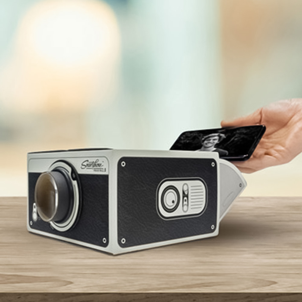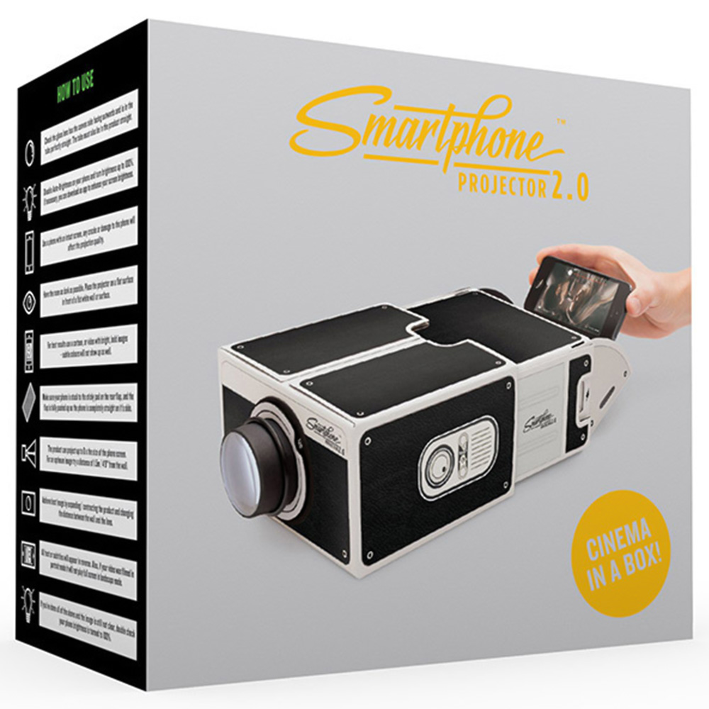 Enjoy memorable movie nights using this White and Black Smartphone Projector 2.0. Crafted from cardboard, it's super-lightweight and it uses a glass lens for projection. It's compatible with any smartphone measuring 8 cm by 16 cm or less and can easily project anything on your phone’s screen. It comes fully assembled so you save time setting it up. With this smartphone projector, you can watch gifs or movies easily. Note: This projector works by mirroring the image, so any writing appears back to front.