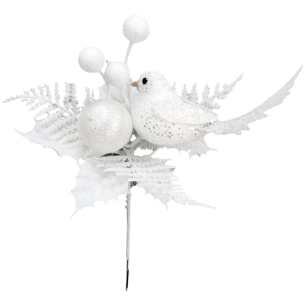 Ideal if you're making your own wreath or floral centrepiece this Christmas, the White Iridescent Bird Pick is a stunning finishing element that's sure to give your make an extra special touch. This realistic-looking pick coated in white features fern, holly leaves, and berries, and is topped with an elegant bird so it gives your wreath a magical look that's sure to impress this festive season. Easy to use and combine with other festive sprays and picks, there's no limit to the floral creations you can come up with.