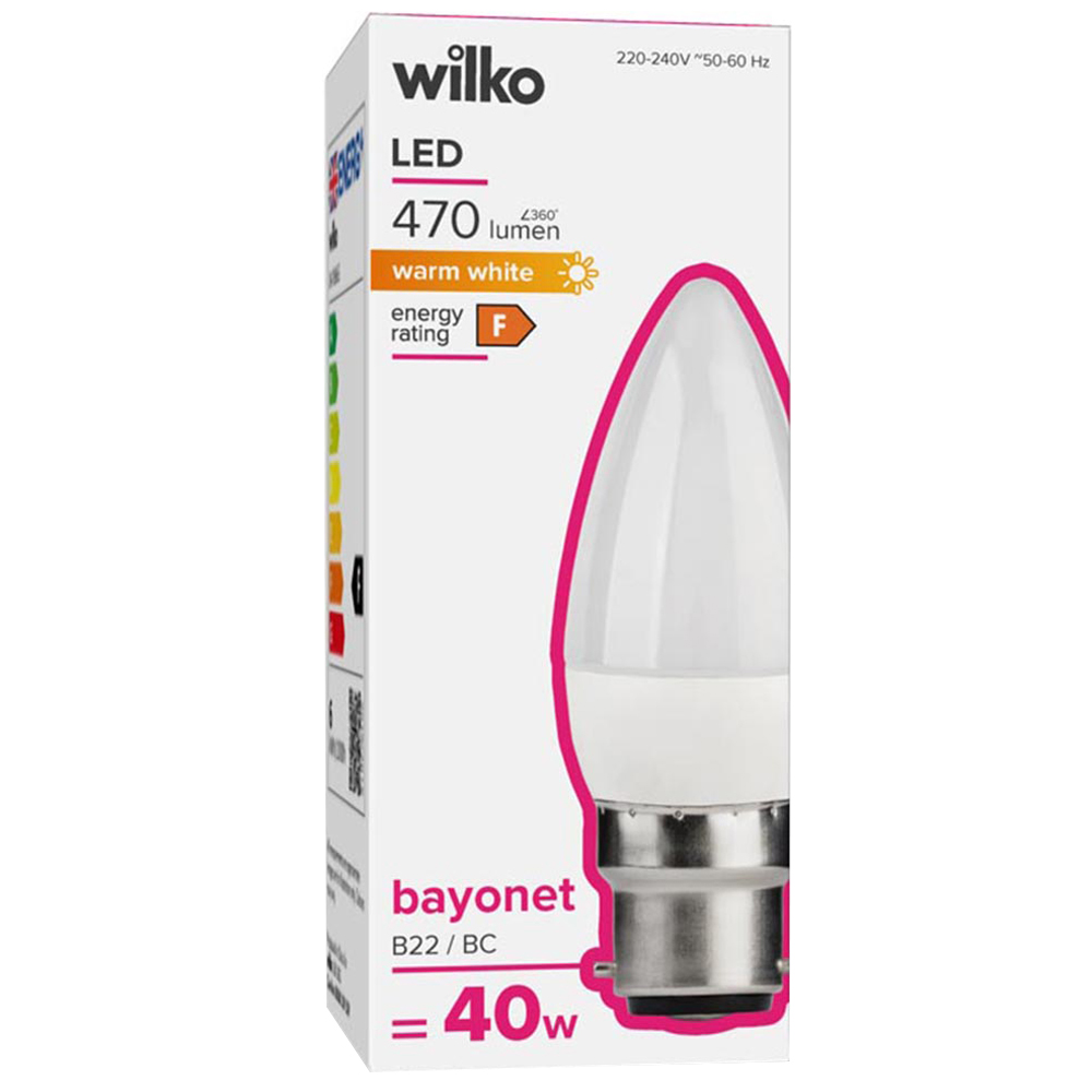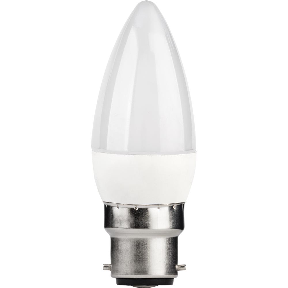 This LED Candle design light bulb with high 470lm brightness is ideal for wall lights, chandeliers and narrow table lamps. Lasting for 25 years, these Candle design LED bulbs save 85% of energy, making them an ideal replacement for older technology bulbs such as Halogen. BC Fitting. Non-dimmable bulb. Always read the instructions before use.