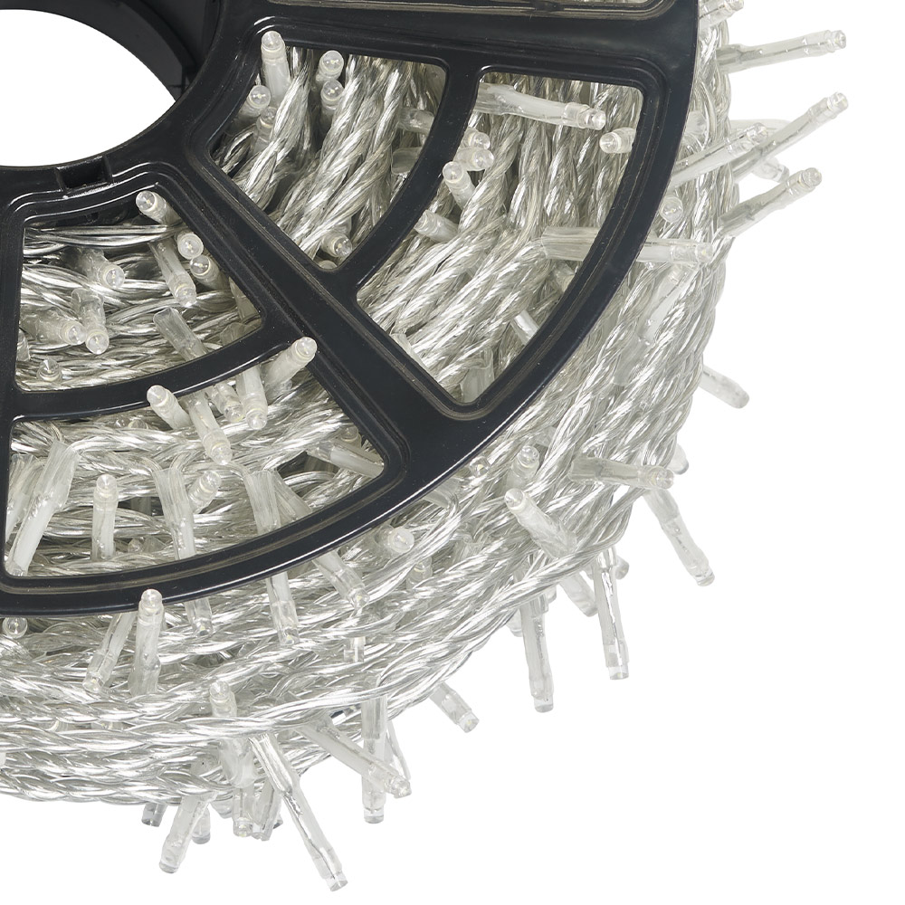 Make your home shimmer and get it ready for festive celebrations with our multifunction string lights. With 1000 multicolour LEDs with a 64.9 metre-long clear cable, the lights can be used indoors and outdoors to add a touch of brightness. The Christmas light feature eight different light effect that can be controlled using the provided memory controller. Plus, it comes with a plastic reel for easy storage. Total length of cable: 64.9m. Number of bulbs: 1000. Colour of LED: Multicolour. Cable colour: Clear Function: 8 Effects Indoor use: Yes. Outdoor use: Yes. Battery included. No Distance to first bulb: 5m. Distance from bulb to bulb: 6cm. Total wattage of chain: 10W. Normal bulb rating: 3V/0.06W. Transformer included: Yes. Transformer model: JT-DC31V12W. Input voltage: 220-240V~. Output voltage: DC 31V. Directions for use: Please follow these instructions carefully to ensure safe and satisfactory use of this product. Although this product can be used outdoors, the transformer should remain indoors at all times. Plug into socket and switch socket on to turn the lights on. Repeatedly press the button on the controller box to select your preferred lighting pattern. Disconnect from the socket or turn socket off to turn off lights. This product is provided with a memory controller and it will retain the same function after switching on again. This product contains LED lights and although non replaceable, these are highly energy efficient and have a greater lifespan than that of ordinary filament bulbs. Take care when positioning lights in your desired location. Suggestions for indoor or outdoor use: Rooflines, gable ends, porchways, on Christmas trees, outdoor trees and over or around window frames. For outdoor use lights should be sheltered from direct wind, rain and snow.