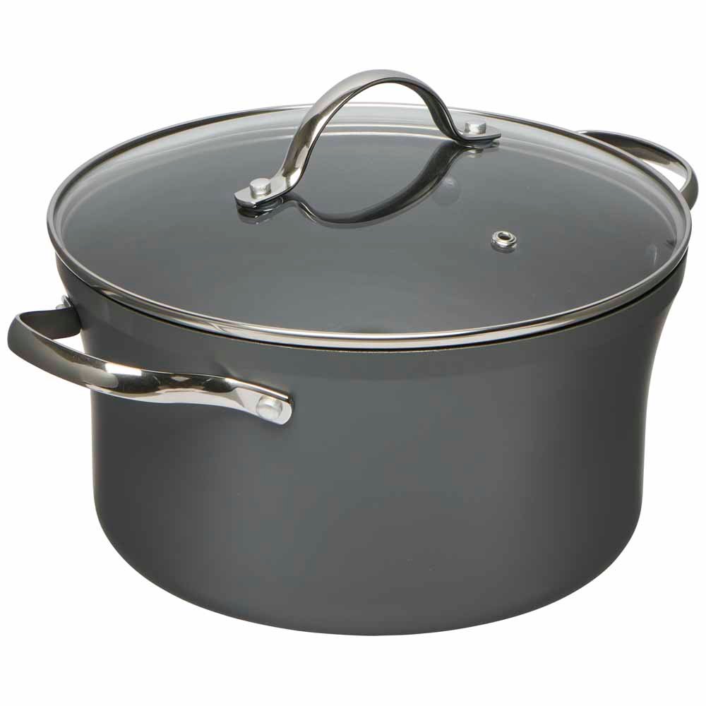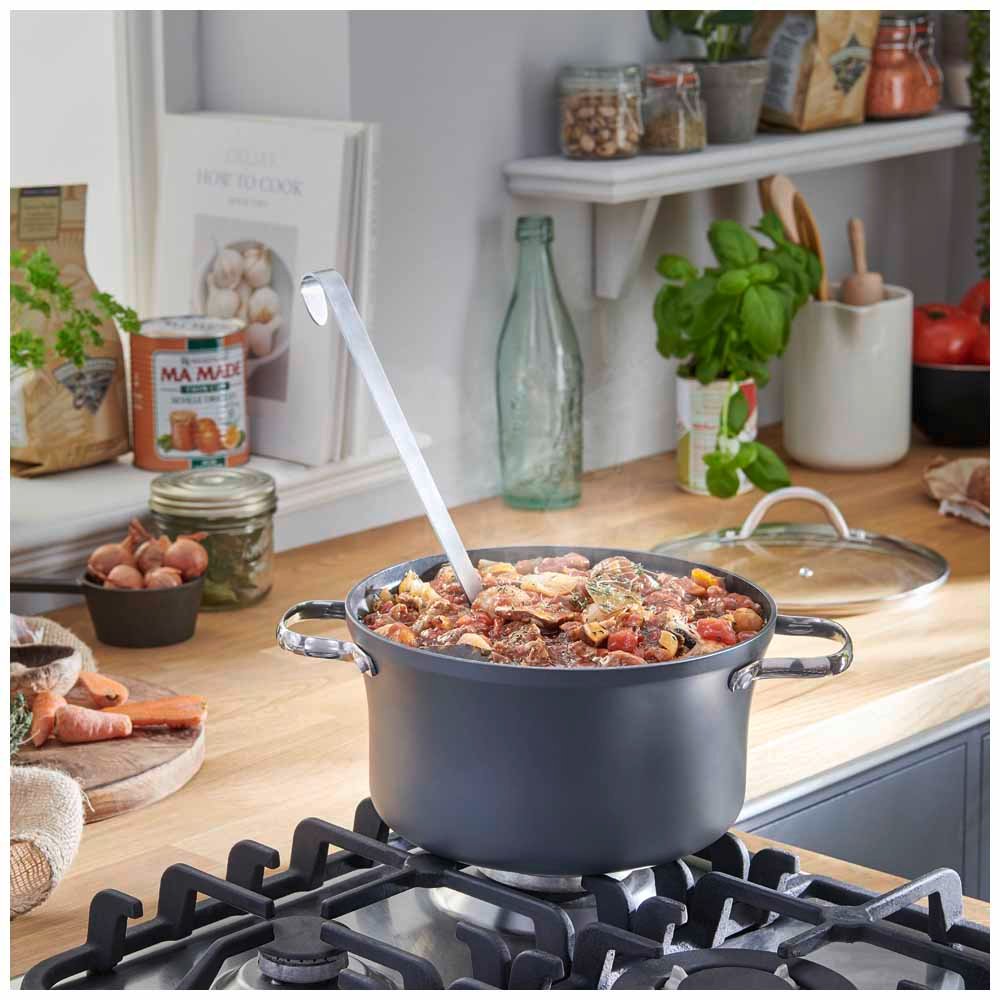 Cook up a storm with our 24cm grey casserole dish. It's suitable for all hobs including induction and won't scratch when you're using metal utensils. The casserole dish is finished with a stainless steel handle and non-stick surface. 10 year guarantee. Dishwasher safe. Oven safe to 220C.