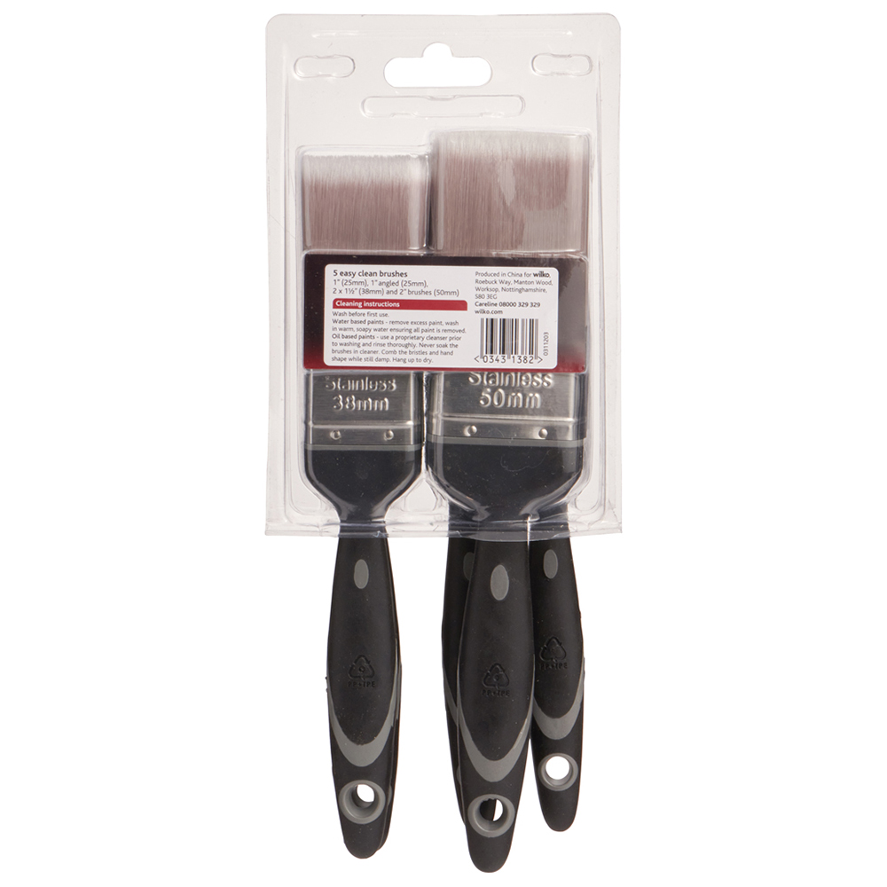 Get your painting job done with perfection with our pack of five Easy Clean Brushes. This easy clean brush set helps you achieve a superior smooth finish. The filaments hold more paint which helps you get the job done more quickly. The angled brush is ideal for cutting in and painting with precision. The other brushes are ideal for general painting projects. The comfortable soft grip handles make these brushes easy to use and give you greater control. The brushes are easy to clean too. Ideal for interior use. Suitable for use with all paint types. Always read instructions. Size: 1" 25mm angled, 1" 25mm, 2 x 1.5" 38mm and 2" 50mm brushes. Direction for use: Before first use, wash and comb to remove any loose filaments. Before each use, wet filaments with water (or white spirit for solvent paint) and remove excess to a slightly damp state. After use, wipe the handle and ferrule it with a damp cloth. Wash with water (or white spirit for solvent paint). Rinse the brush head thoroughly with clean water and remove excess water with a clean paper or old towel. Comb to shape and hang dry naturally. Once dry, place in a brush wrapper or a dry, dust-free place ready for your next project.