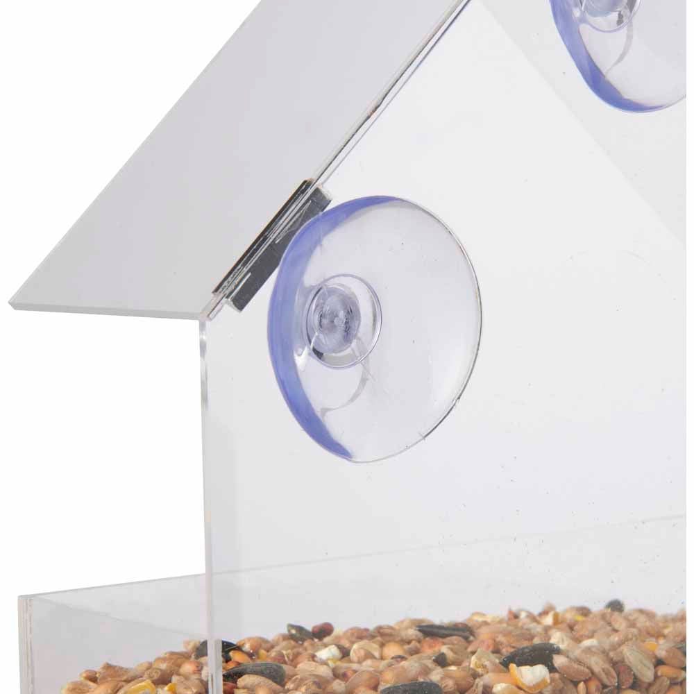 Make your windows a point of attraction for garden birds with our Acrylic Window Bird Feeder. Easy to fill and clean, it features three suction cups that allow easy installation. Suitable for different seeds and feed, the feeder is ideal to use on a clear outdoor window. Directions for use: For outdoor and clear window use only. Clean the window and suction the cup surface with a dry cloth before putting it on the surface. Simply press the suction cups against the window from the middle to the edge to squeeze the air out and stick firmly to the window. Place the bird feeder in a suitable place trying to keep it away from places predators can hide. Regularly clean feeders and feeding areas with warm water and mild disinfectant. Always wash your hands thoroughly after handling feeders. Assembly instructions: Insert the suction cup head into the hole and slide upward to the slot to fix the suction cup.