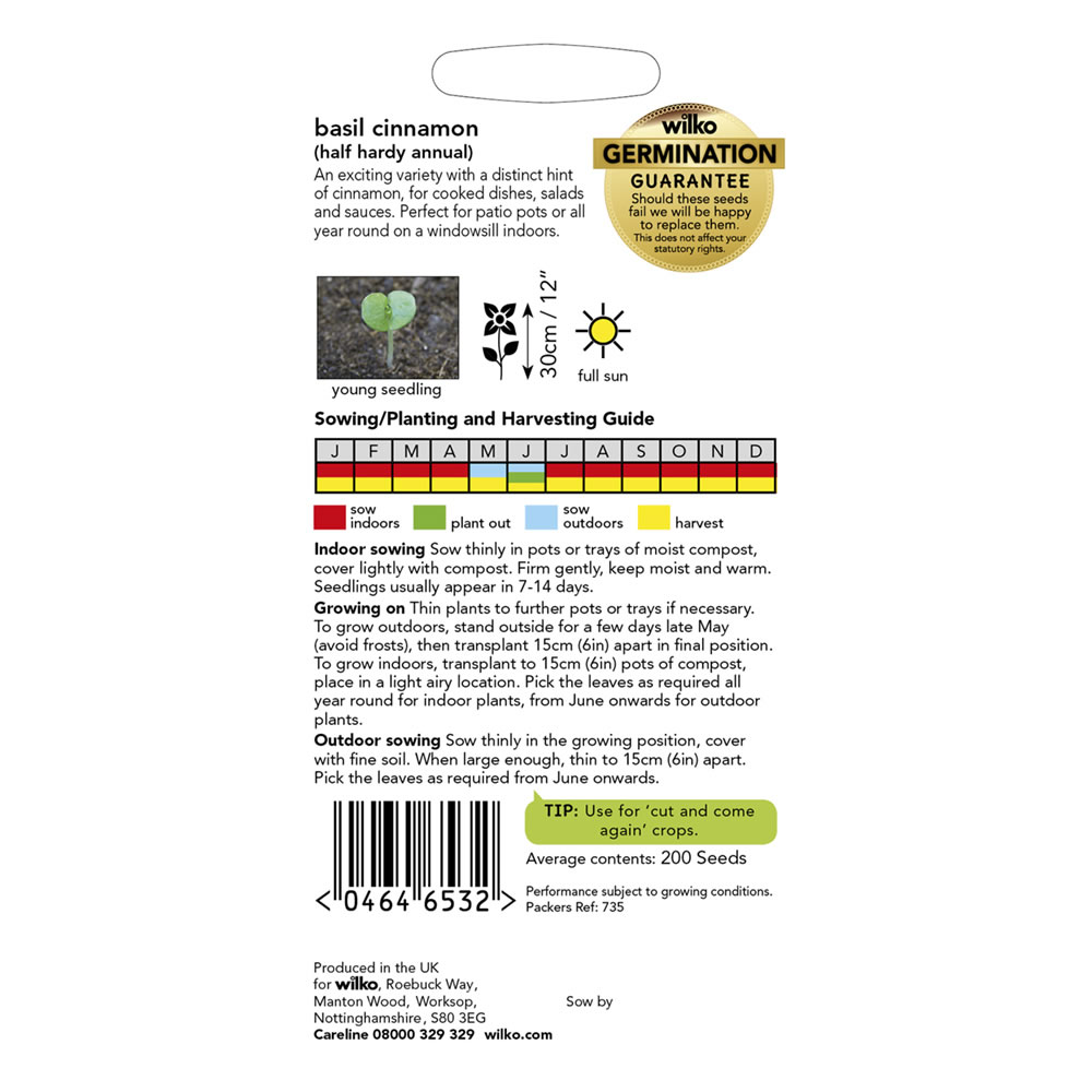 Our Basil Cinnamon Seeds are an exciting variety with a distinct hint of cinnamon. The leafy and productive plants are ideal for a herb garden or mixed patio pots while also making the perfect choice for Mediterranean or Asian dishes, salads, soups, pesto and sauces. An annual herb. Sow indoors all year round for crops indoors on a windowsill or from March to May to plant outside. Alternatively, sow directly outdoors in patio pots or a herb garden from May to June. Outdoor crops are ready to harvest from June onwards. The average pack contains 200 seeds.
