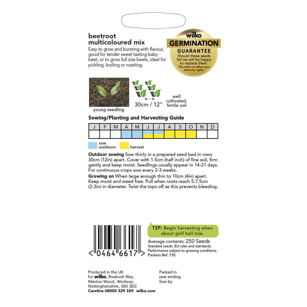 Grow fresh produce at home with our Beetroot Multicoloured Mix Seeds. It produces a brightly coloured mix of sweet and tasty roots. They're easy to grow and are bursting with flavour. These eye-catching beets are guaranteed to be a talking point when used either as a sweet and tasty cooked vegetable, pickled, in salads or fried as colourful vegetable crisps. Sow outdoors from April to July, ready to harvest from June to October. Average pack contains 250 seeds.