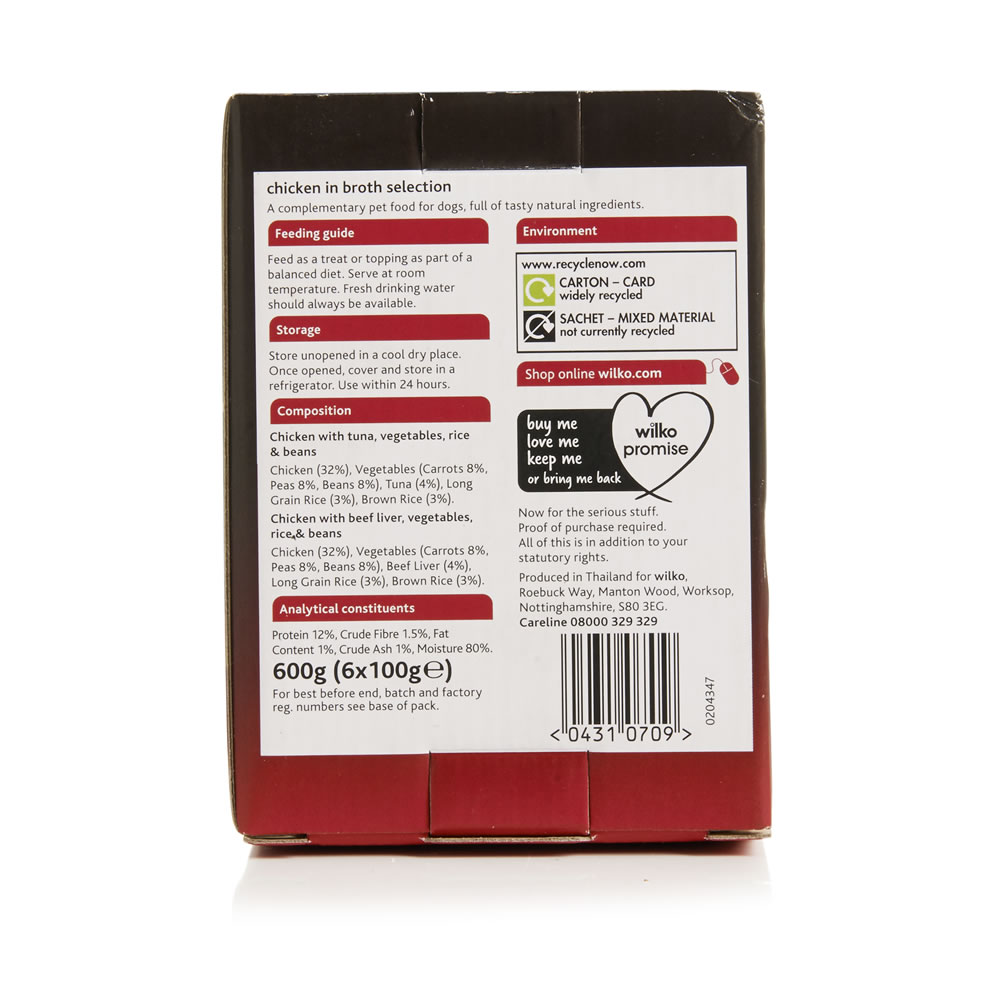 Our Wilko Best chicken in broth selection is a complementary pet food for dogs, full of tasty natural ingredients. The delicious flavour combinations are as nutritious as they are delicious, and are sure to get tails wagging! Either serve as a treat or topping as part of a balanced diet. Contains 6 x 100g pouches. 3 x chicken with tuna, vegetables, rice and beans, and 3 x chicken with beef liver, vegetables, rice and beans. See pack for feeding guide.