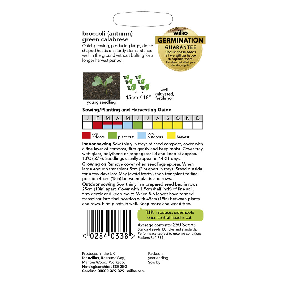 Grow fresh produce in your garden with our Broccoli (Autumn) Green Calabrese Seeds. These are quick growing and produce large, dome-shaped heads on sturdy stems. These crops stand well in the ground without running to seed too quickly, producing high-quality heads over a longer harvest season. Sow indoors from February to April or outdoors from March to May, ready to harvest from August to October. The average pack contains 250 seeds.
