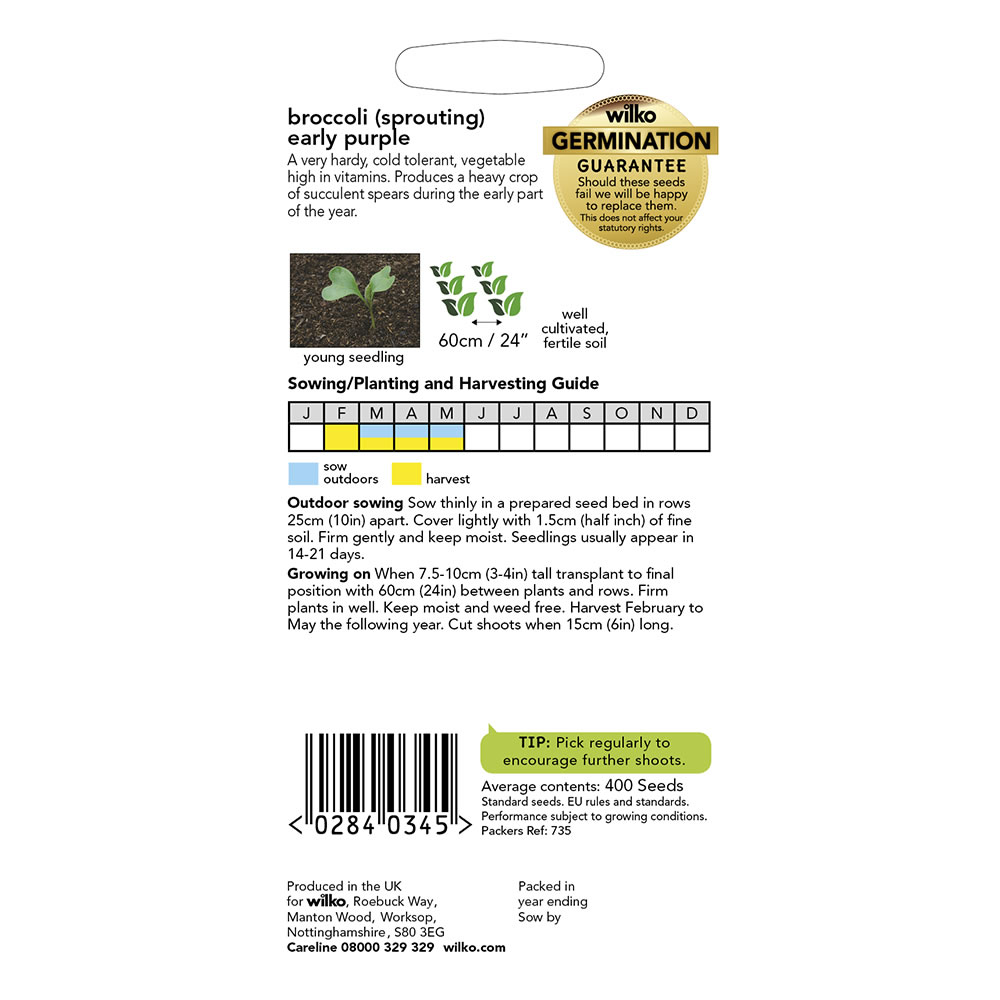 Grow fresh produce in your garden with our Broccoli Early Purple Sprouting Seeds. This is a heavy crop which is full of succulent spears during the early part of the year - providing a great addition to your cooking. Sow outdoors from March to May, ready to harvest from February to May. The average pack contains 400 seeds.