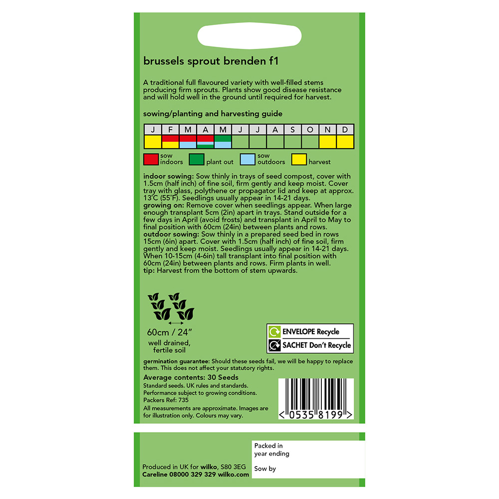 Our Brussels Sprout Brender F1 seeds produce a traditional full-flavoured variety with well-filled stems, producing firm sprouts. Plants show good disease resistance and will hold well in the ground until required for harvest. The seeds are for indoor sowing. Sow thinly in trays of seed compost, cover with 1.5cm (a half inch) of fine soil, firm gently and keep moist. Cover the tray with glass, polythene or a propagator lid and keep it at approx. 13 degrees Celsius. The seedlings usually appear in 14-21 days. Sow: Feb-May and harvest Nov-Feb. Tip: Harvest from the bottom of the stem upwards. The pack contains an average of 30 seeds. Should these seeds fail, we will be happy to replace them. This does not affect your statutory rights.