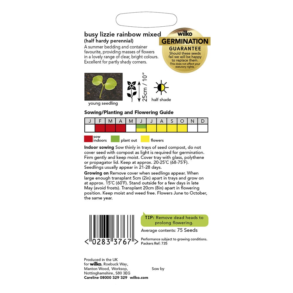 Our Busy Lizzie Rainbow Mixed Seeds are a summer bedding and container favourite as they provide masses of white, red and pink flowers. Excellent for partly shaded corners, bedding schemes, border edging and all sorts of patio containers. Sow indoors from February to April, ready to flower from June to October. The average pack contains 75 seeds. Height: 25cm.