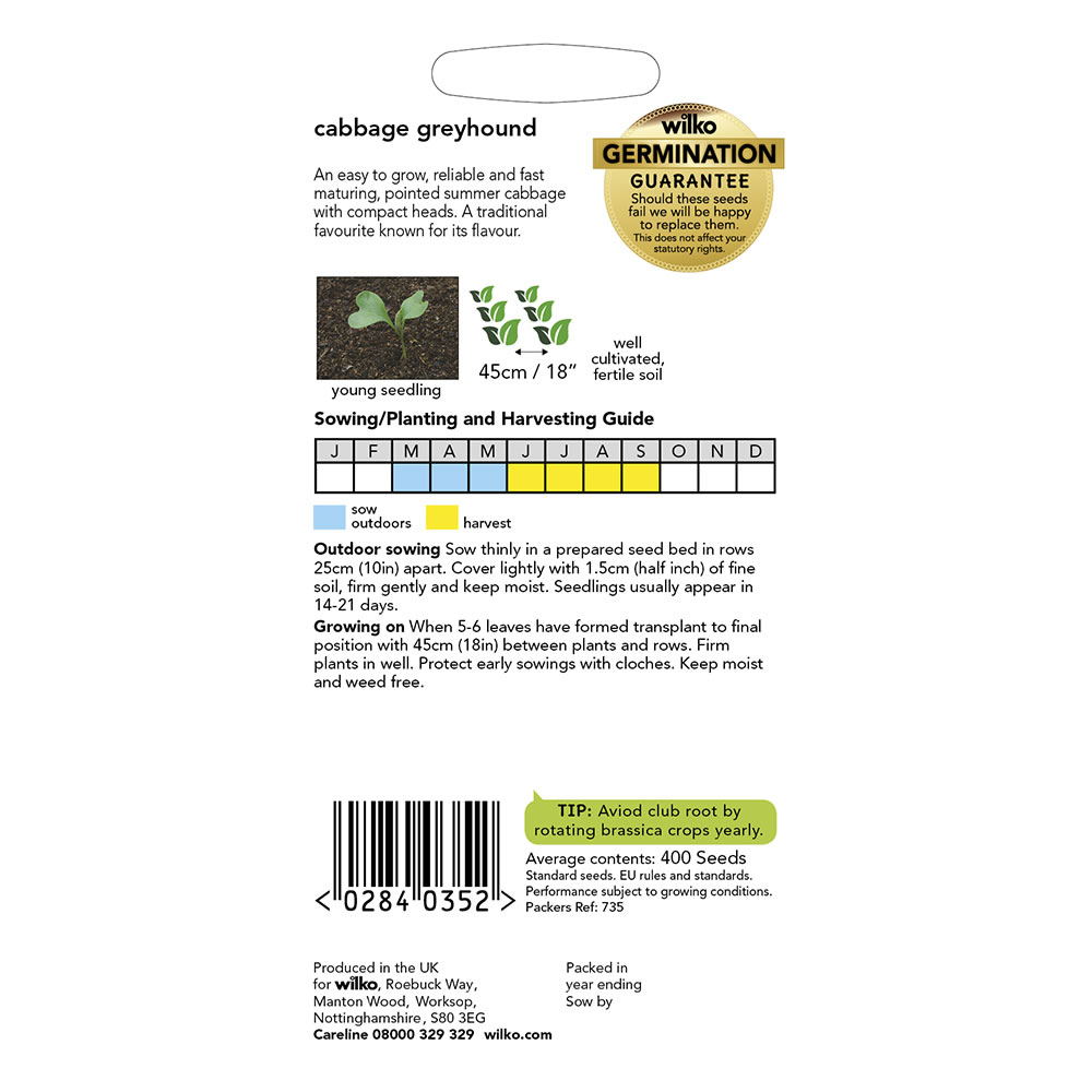 Grow fresh produce in your garden with our Cabbage Greyhound Seeds. Easy to grow - it produces a fast-maturing, pointed summer cabbage with a dense head and a small core. This traditional favourite is known for its reliability and delicious flavour. Sow outdoors from March to May, ready to harvest from June to September. The average pack contains 400 seeds.