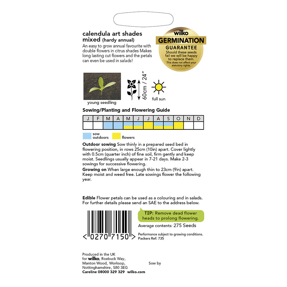 Our Calendula Art Shaded Mixed Seeds are an easy-to-grow favourite with double flowers in bright citrus shades. Producing long-lasting flowers, these are great for enjoying as-cut flowers, and the petals can even be used in salads. Plants will often self-seed to provide further displays in future years. A hardy annual. Sow outdoors from March to June and August to September, ready to flower from May to October. The average pack contains enough seeds for 275 plants. Height: 60cm.