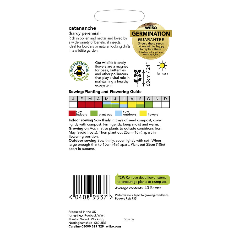 Our Catananche Seeds produce stunning electric blue flowers set off by prominent dark centres. Rich in pollen and nectar, they are a useful food source and will attract a wide variety of beneficial insects into the garden. Beautiful sown in natural-looking drifts in mixed borders or a wildlife garden. A hardy perennial. Sow indoors from February into April or outdoors from May into July in a sunny spot, ready to enjoy from June to September. The average pack contains 40 seeds. Height: 60cm.