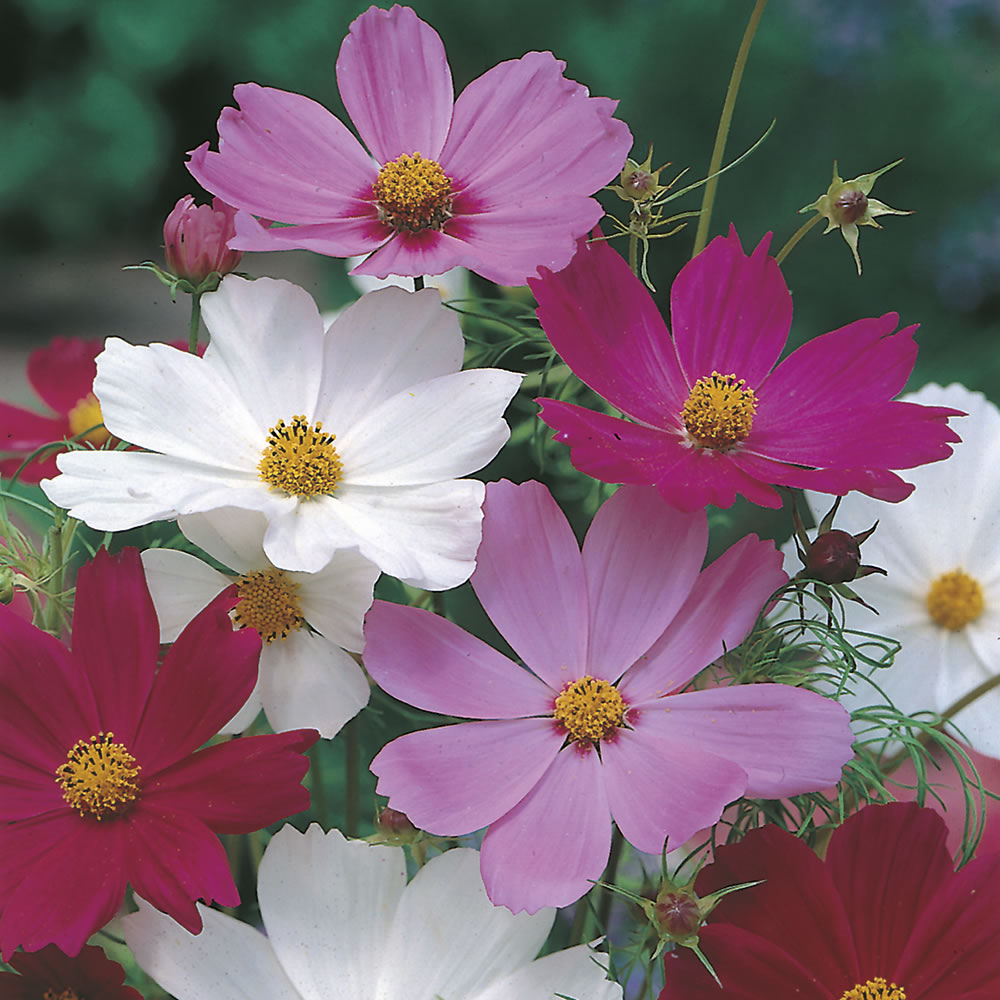 Our Cosmos Sensation Mixed Seeds produce a bright and breezy mixture of this popular, long-flowering annual. The tall plants have feathery leaves and a graceful airy habit. Ideal for the back of borders, they also provide stunning cut flowers in pink and white for your home. Sow indoors from February to April or outdoors from April to May, ready to flower from June to October. The average pack contains 200 seeds. Height 120cm.