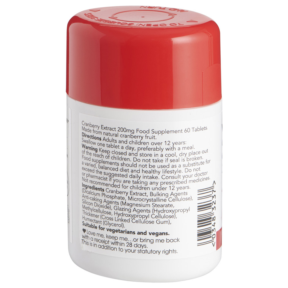 Our cranberry extract 200mg food supplement helps support all round good health. They are made from natural cranberry fruit. No artificial colours, flavours or preservatives. Suitable for vegetarians and vegans. Free from yeast. Suitable for adults and children over 12 years. Pack contains 60 tablets. Always read the label. Food supplement. Cranberry extract. Keep out of sight and reach of children. Do not take is blister is broken. Food supplements should not be used as a substitute for a varied, balanced diet and healthy lifestyle. Do not exceed the suggested daily intake, please see pack for nutritional information, NRVs and ingredients list. Consult your doctor or pharmacist if your are breast feeding, pregnant or planning to become pregnant. Consult your doctor or pharmacist is you are taking any prescribed medicines. Not recommended for children under 12 years. Free from yeast. Suitable for vegetarians and vegans. Please read all instructions carefully before use.