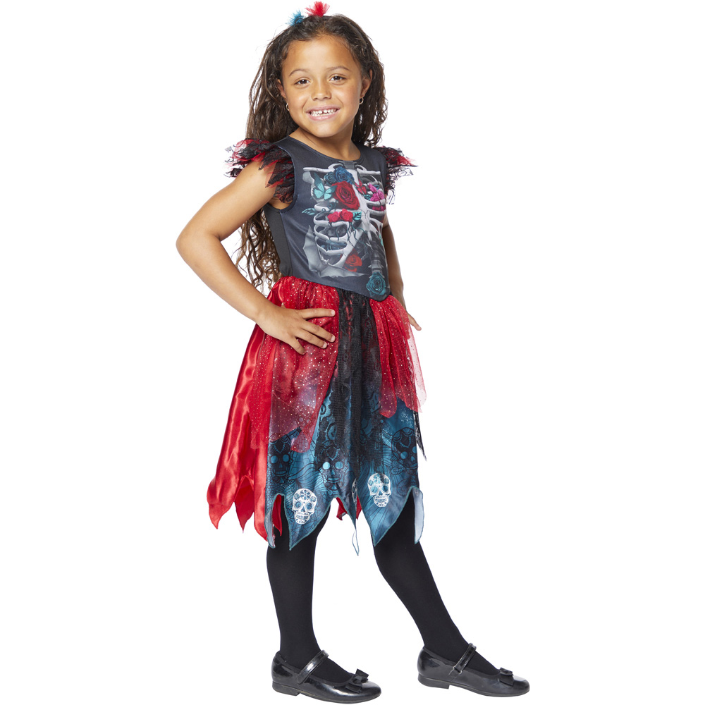 Embrace the Day of the Dead with our Day of the Dead Costume. This costume includes a dress and headband. Made with 100% polyester, this costume is suitable for children between seven to eight years and up to 128cm tall. Care and use: Materials: 100% polyester, exclusive of trims. Sponge clean only. Do not bleach. Do not iron. Do not tumble dry. Do not dry clean.