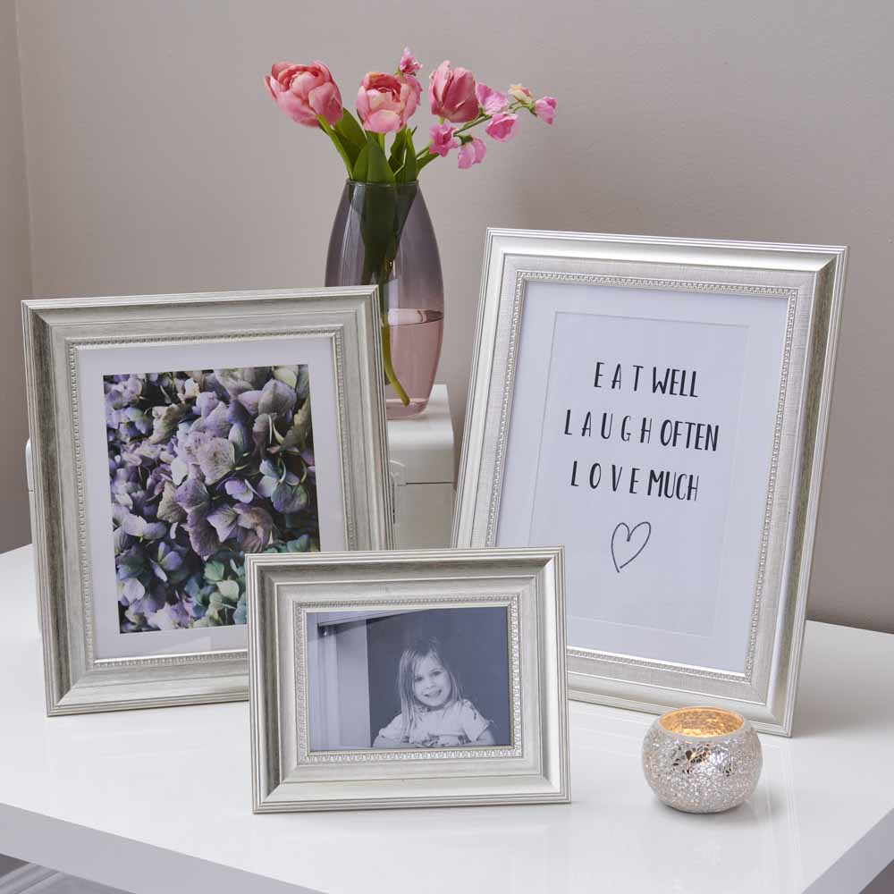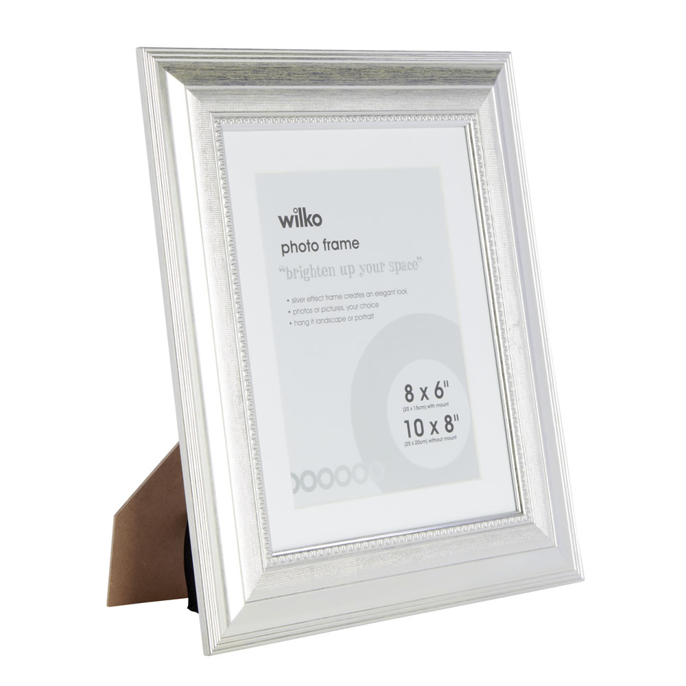 Show off your favourite photos or pictures beautifully, in this elegant silver effect photo frame. Team this stunning frame with other picture frames, and group together on your wall, to give your interior an artistic and opulent feel. This picture frame can be hung portrait or landscape.