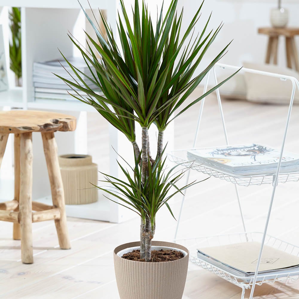 Give your decor a natural glimmer with our Dragon Tree with Latte Recycled Pot Cover 12cm. Our Dracaena Marginata plant looks like a miniature palm tree, adding a tropical touch to your home. This evergreen shrub features a crown of long, sword-shaped, dark green leaves, finely edged in reddish-brown. It is low-maintenance and ideal for those new to gardening. The Dragon Plant requires a bright position, making it perfect for light windowsill out of direct sunlight and away from artificial heat sources such as radiators. This plant grows slowly, taking 10 years to reach approximately 150cm, not overtaking your home. You can create an instant attractive display by slotting this houseplant into the supplied brown pot cover. Our eco-wood pot cover is made of 40% natural raw materials, including wood chips and coffee husks. You have to lower the houseplant, nursery pot and all, straight into this watertight container for no mess or fuss planting. The plant is supplied as an established plant in a 12cm nursery pot with a 14cm pot cover. It grows 400cm high and 250cm wide.