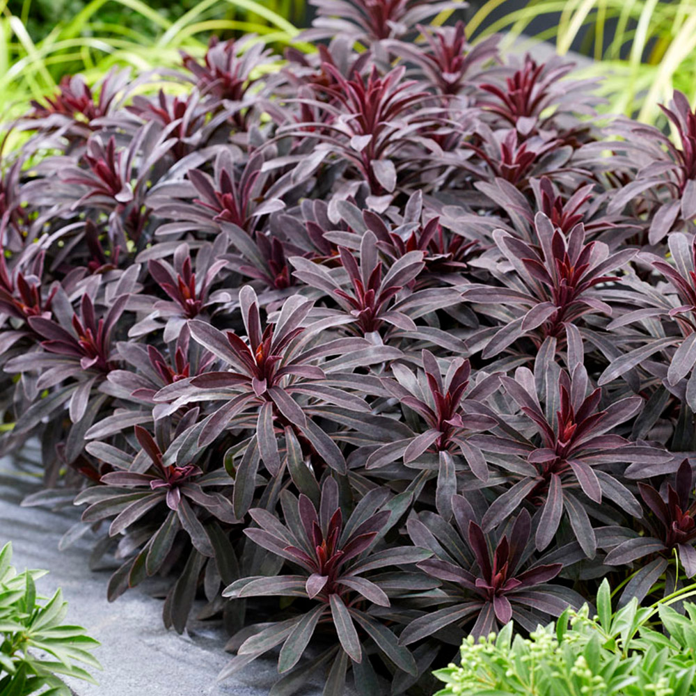 Enjoy year-round interest with our Euphorbia Miners Merlot Plant Pots. Being extremely drought tolerant, this variety is known as one of the easiest perennials to grow. Hardy to temperatures as low as -15°C, they are vigorous growers making them the perfect choice for borders, planters, or containers. The tips of the stems are even capped with yellowy-green flowers which will attract pollinators such as bees and butterflies. They boast colour-changing foliage from reddish purple when young to near-black when temperatures plummet in autumn, resulting in some striking colour combinations. These plants are supplied as three established plants in 9cm pots. Please note: The height of the delivered plants will vary with the time of year and therefore 'as supplied' images are an indication only. All heights given include the height of the growing container. Planting instructions: Grows: 60 x 60cm. Plant: March to October. Flowers: April to October.