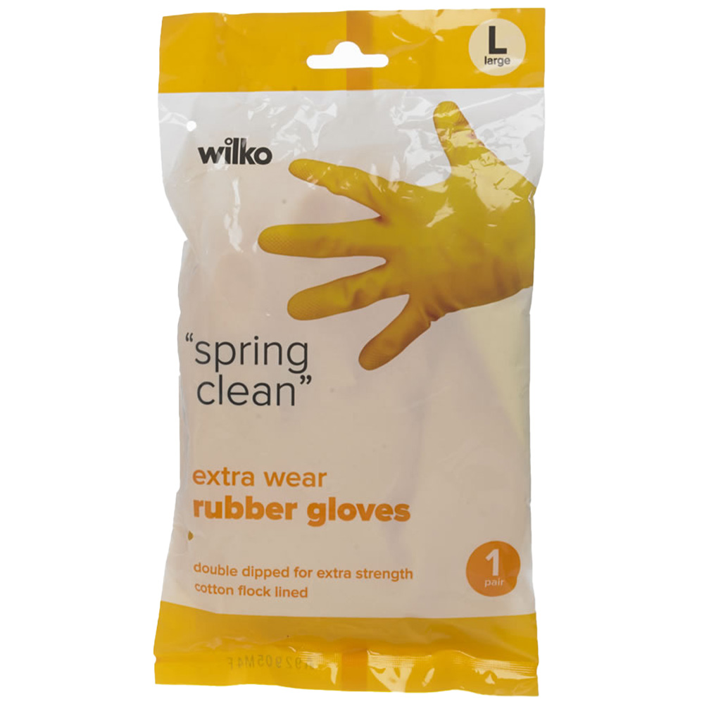 Brighten up your daily chores and protect your hands at the same time with our extra wear rubber gloves in cheerful canary yellow. These gloves are double dipped for extra strength and offer added protection against the damaging effects of household detergents, hot water and dirt. They also provide an improved grip in both wet and dry conditions. WARNING Contains natural rubber latex which may cause an allergic reaction. Always read the label. Size: Large.