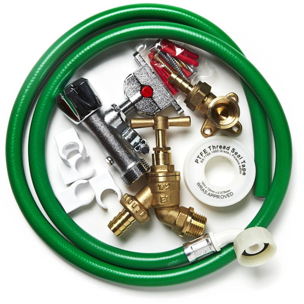 Keep those plants watered with this great Garden Tap Installation Kit which includes everything you need to fit an outside tap. The kit includes 1 x 1/2in garden tap, 1 x self cutting tap, 1 x 1.25m hose, 1 x compression wall plate elbow, 1 x brass spigot, 1 x PTFE tape reel, 1 x hose clip, 4 x pipe clips, screws, wall plugs and washers. Always read instructions.