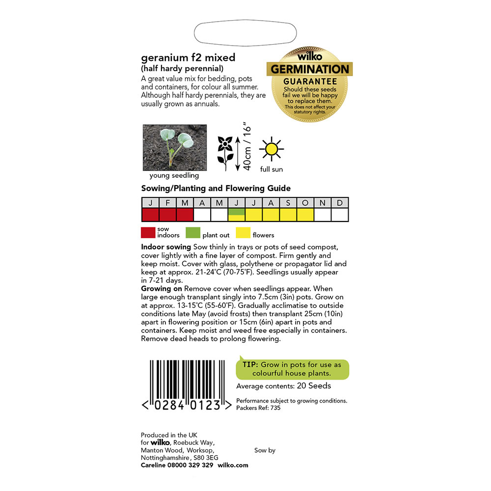 Our Geranium F2 Mixed Seeds provide a great mix for bedding, pots and containers. Providing colour with all summer with pink, white and red blooms. Sow indoors from January to March ready to flower from June to October. The average pack contains 20 seeds. Height: 40cm.