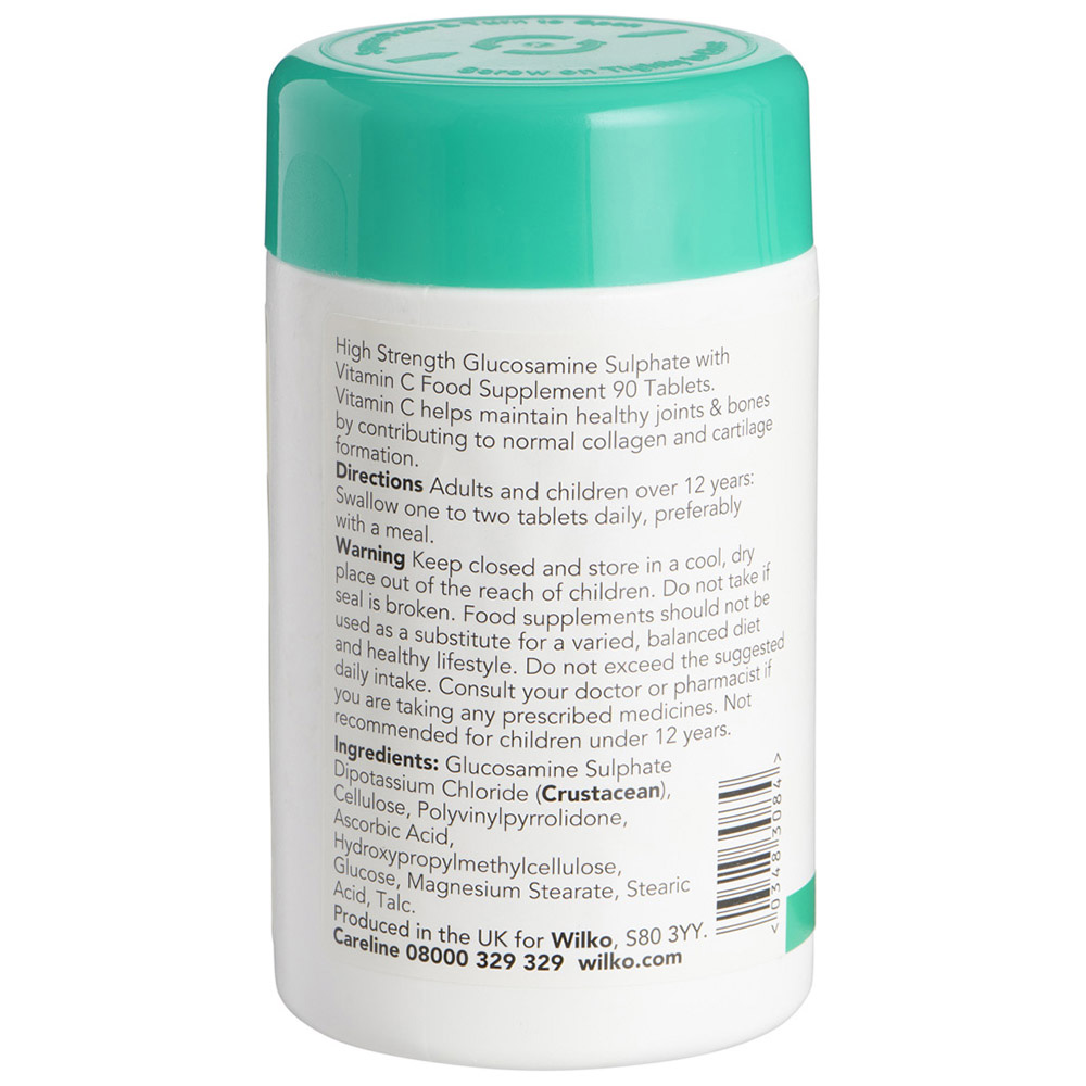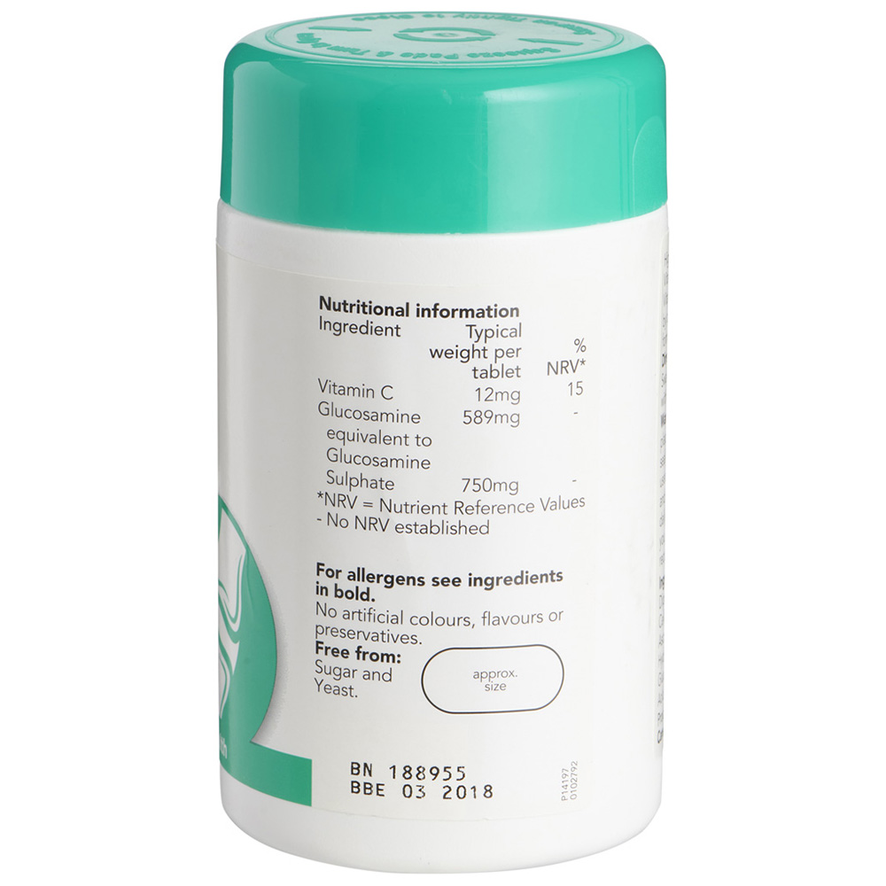 Our Glucosamine Sulphate with Vitamin C Food Supplement Tablets help to maintain healthy joints and bones, by contributing to normal collagen and cartilage formation. No artificial colours, flavours or preservatives. Free from yeast. Suitable for adults and children over 12 years. Pack contains 90 tablets. Always read the label.Please always read the label before use. Ingredients: Glucosamine Sulphate Dipotassium Chloride (Crustacean), Cellulose, Polyvinylpyrrolidone, Ascorbic Acid, Hydroxypropylmethylcellulose, Glucose, Magnesium Stearate, Stearic Acid, Talc. For allergens, see the ingredients in bold. Product type: High Strength Glucosamine Sulphate with Vitamin C Food Supplement 90 Tablets. Storage: Keep closed and store in a cool, dry place out of the reach of children. Nutrition Information Typical Weight Per Tablet (%NRV*) Vitamin C: 12mg (15%) Glucosamine: 589mg - equivalent to Glucosamine Sulphate: 750mg - * NRV = Nutrient Reference Value