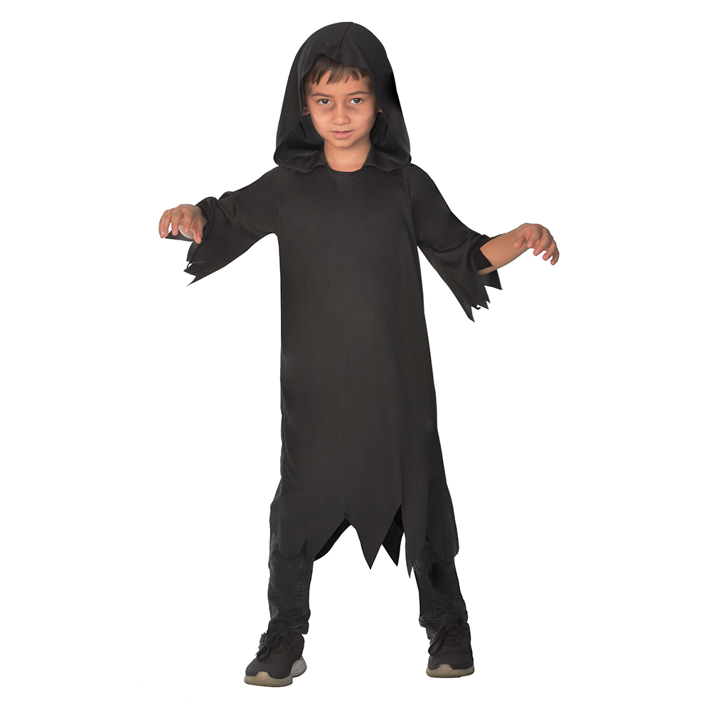 Instantly transform yourself this Halloween with our Grim Robe. The hooded robe is made from polyester and comes in black, providing you with all the fear factor you'll need for parties or trick-or-treating with the kids. Size: One size up to 152cm. Care and use: 100% polyester, exclusive of trims. Hand wash only. Do not bleach. Do not iron. Do not tumble dry. Do not dry clean.