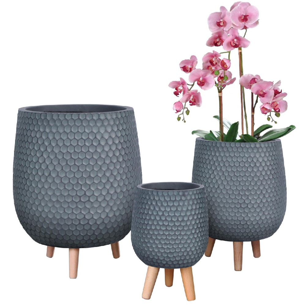 Elevate your indoor decor with our Honeycomb Grey Round Indoor Planter on Legs 34cm, meticulously crafted from a durable mix of fibreglass and stone. This planter boasts a handcrafted stony matt finish, blending green honeycomb tones with a slate grey main body. It measures H34 x D21cm and holds 6 litres, making it suitable for a variety of households. Designed without drainage holes for indoor use, it features sturdy wooden legs that serve as an integrated plant stand, combining modern design with practical elegance.