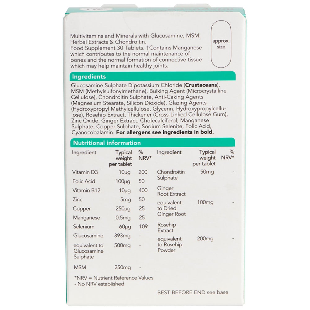 Our advanced jointcare* multivitamins and minerals with Glucosamine, MSM and Chondroitin food supplement includes 30 tablets for joint and bone health. *Contains Manganese which contributes to the normal maintenance of bones and the normal formation of connective tissue which may help maintain healthy joints. Directions: Adults and children over 12 years: swallow one tablet a day, preferably with a meal.